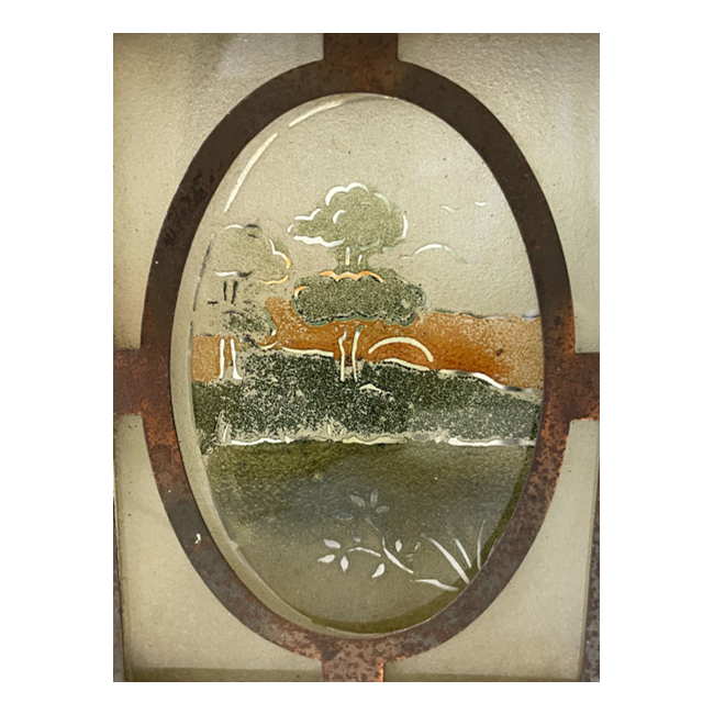 The oriental lantern style shade dates back to the 1920s. The light shade has frosted glass panels depicting rural scenes with a metal casing holding them securely together.