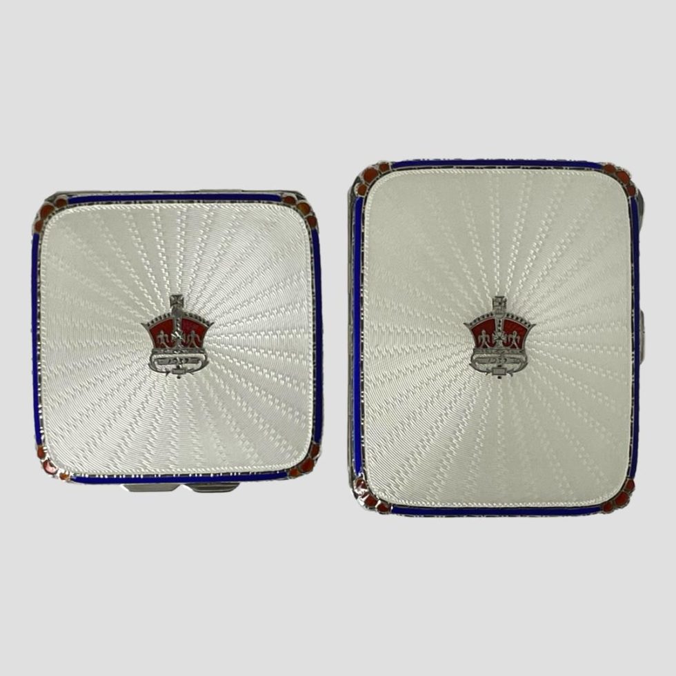 Sterling silver compact and matching cigarette case from 1937 Coronation. A wonderful pair of sterling silver and guilloche enamel items to commemorate the coronation of George VI. The compact is without powder and has a mirror in near perfect condition. It does not close shut. Measures 70mm by 67mm. The cigarette case has a gilt interior which is a little worn and original elastic which has lost its elasticity and matches the gilt interior. It measures 82mm by 68mm. The enamel on both pieces is immaculate without flaws. They are both fully hallmarked for Birmingham assay and made by Adie Bros c1936. There is an additional hallmark of a lion passant to the opener on the cigarette case.