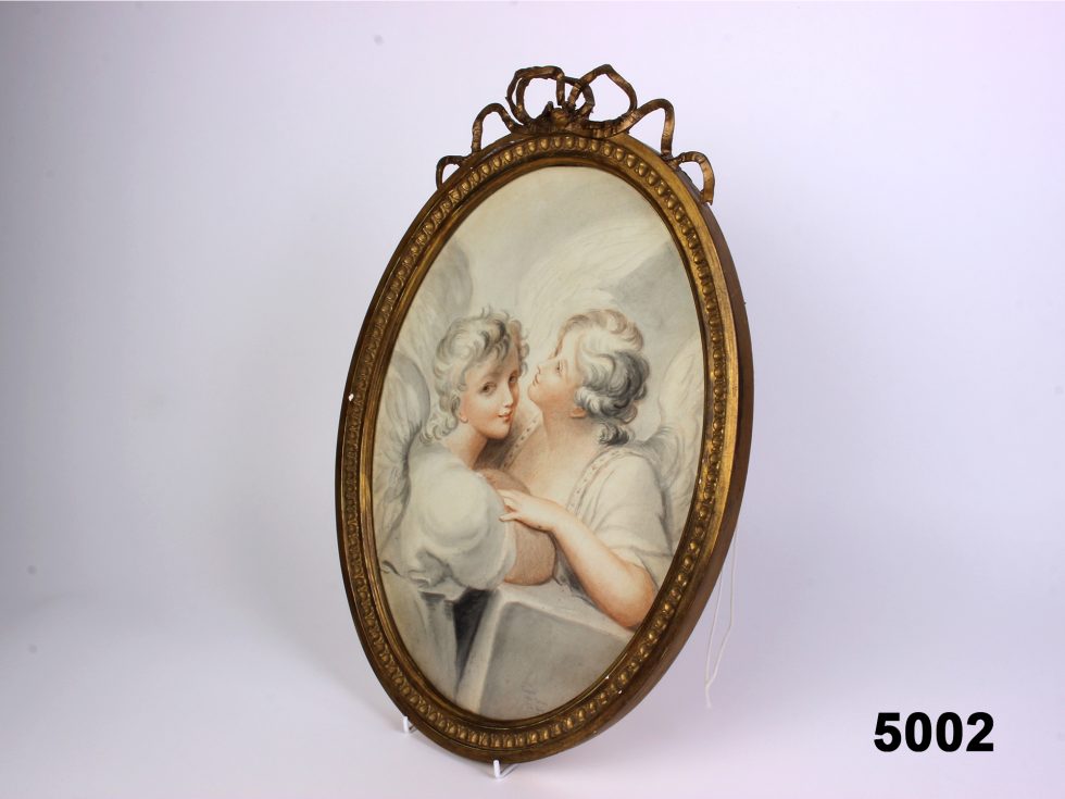 The 19th-Century watercolour is a delightful painting in subtle colours featuring two beautiful angels, ‘Angels after Ciprian’ by Poole. The watercolour is in an oval gilt frame and measures 310mm x 440mm. The painting would look wonderful in a bedroom showing off its soft dreamy colours and antique look. To care for the 19th-century watercolour just use a soft cloth and dust it occasionally.