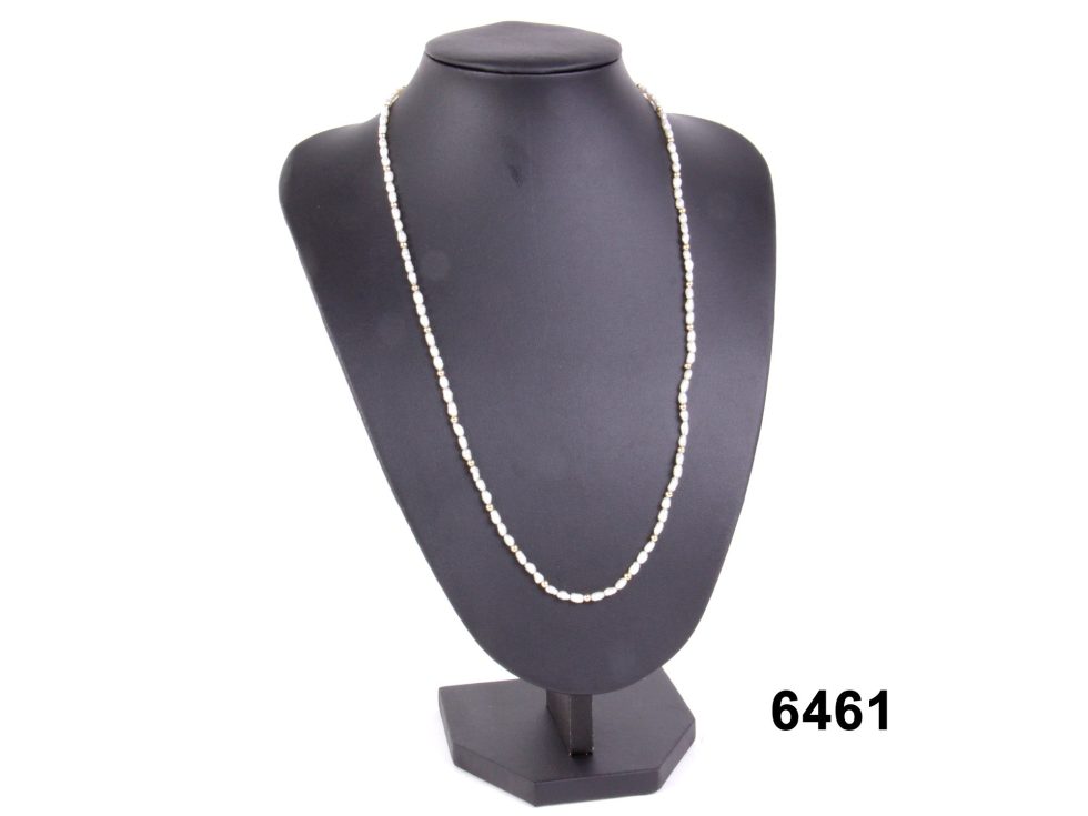The 9-carat freshwater pearl necklace features a long row of freshwater pearls interspersed with gold balls adding elegance and interest to this beautiful necklace. The necklace would display well on an open-neck shirt or low-cut dress where it can shimmer and shine in the light. To care for the 9-carat freshwater pearl necklace, we suggest a light polish with a soft cloth occasionally.