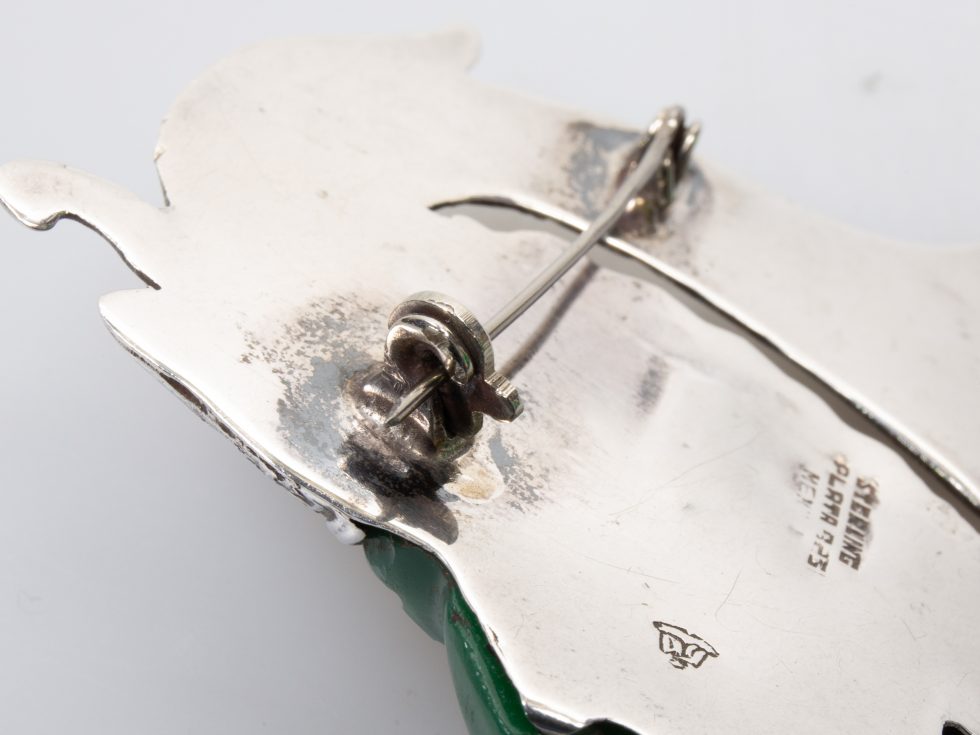 The 925 Mexican silver brooch by Plata is a representation of an Inca warrior with a silver helmet and a face in profile in green bakelite. The highly decorative helmet has a moving earring and a circular green bakelite adornment with a hallmark on Its reverse stating 925 silver. The brooch would display well on a lapel collar or would be a great addition to an existing silver jewellery collection. To care for the 925 Mexican silver brooch by Plata use a soft cloth and gently polish it when required.