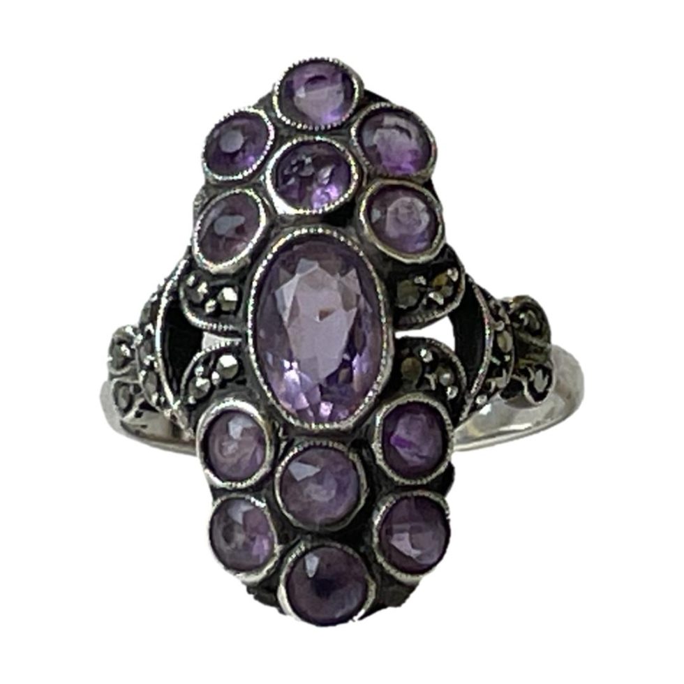 935 argentium silver ring set with amethysts. An unusual vintage ring with oval cut amethyst to the centre and a cluster of 6 round cut amethysts above and below. Accentuated with marcasite to the sides and shoulders. Very Art Deco look about it. Hallmarked 935 to inside band. Ring size N / 6.75