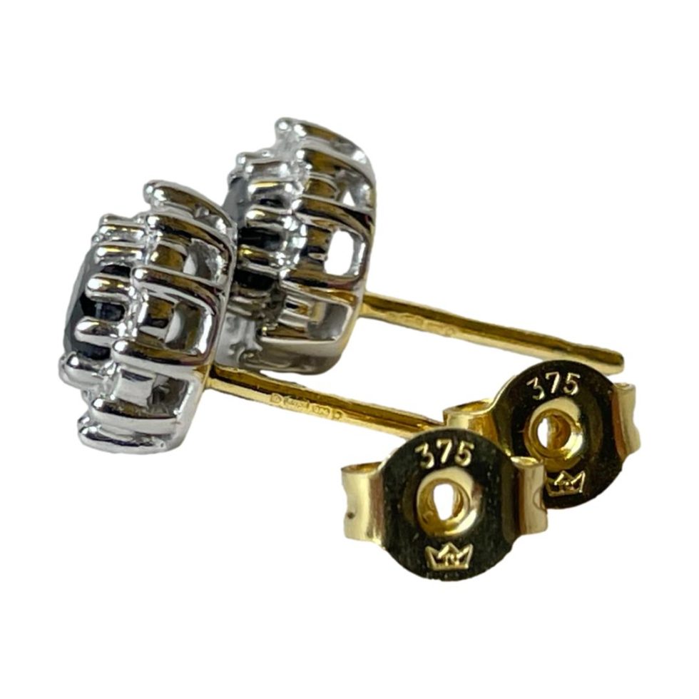 9 karat gold stud earrings with sapphire and diamonds. Pretty pair of 9 karat gold stud earrings with an oval cut sapphire to the centre framed by 12 small round cut diamonds. Hallmarked to the earring posts and butterfly fasteners. Earring front measure 10mm by 8mm.
