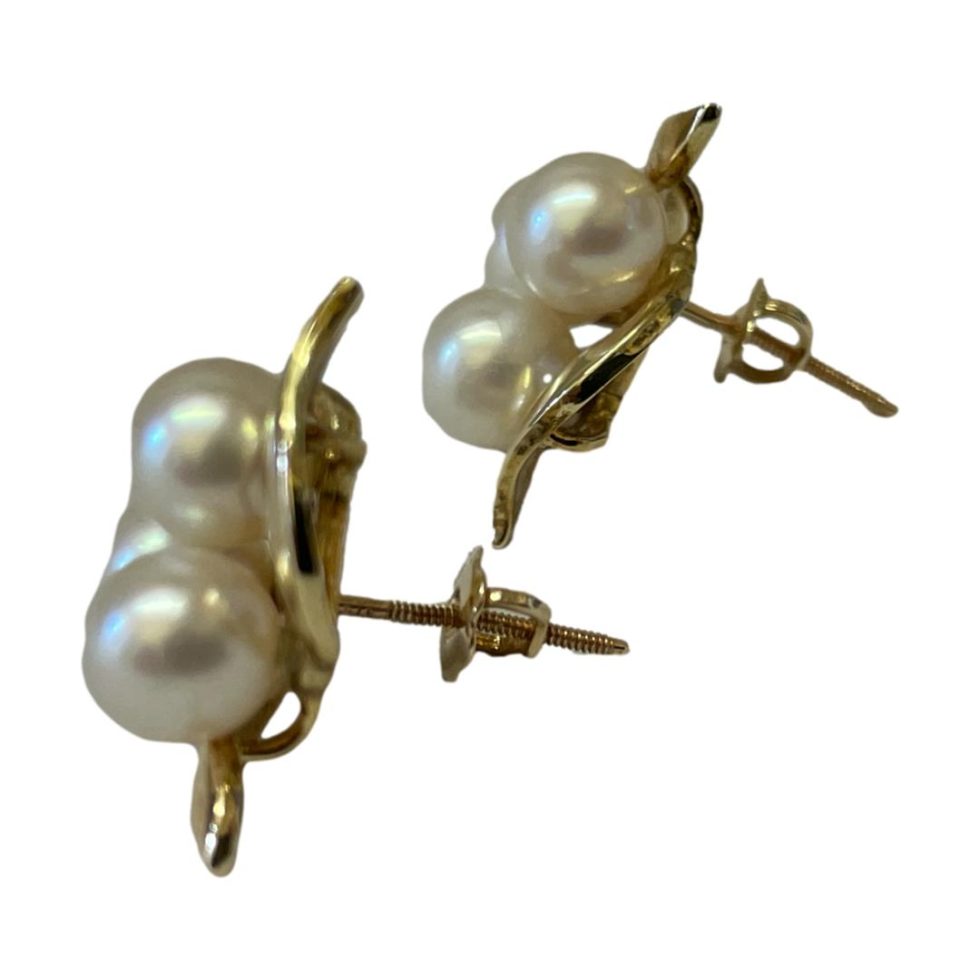 9 karat gold screw-back stud earrings with pearls. Pretty pair of stud earrings each set with 3 pearls. Screw-back fastening gives added security as well as holding earrings in place. Hallmarked to the stud posts and butterflies. The posts are a little misshapen but the screw fastening is not affected & remains secure. Measures approximately 20mm to each of the 3 sides.