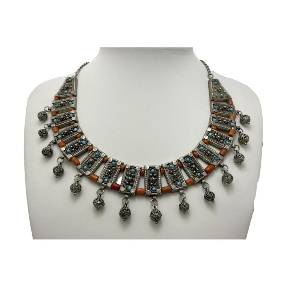 Ag Silver collar necklace features a collection of rectangular silver panels each with decorative turquoise stones, silver filigree balls, and coral intersections.