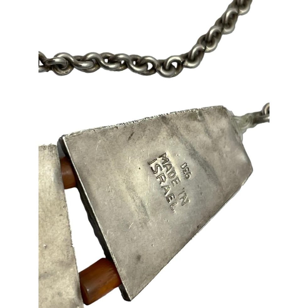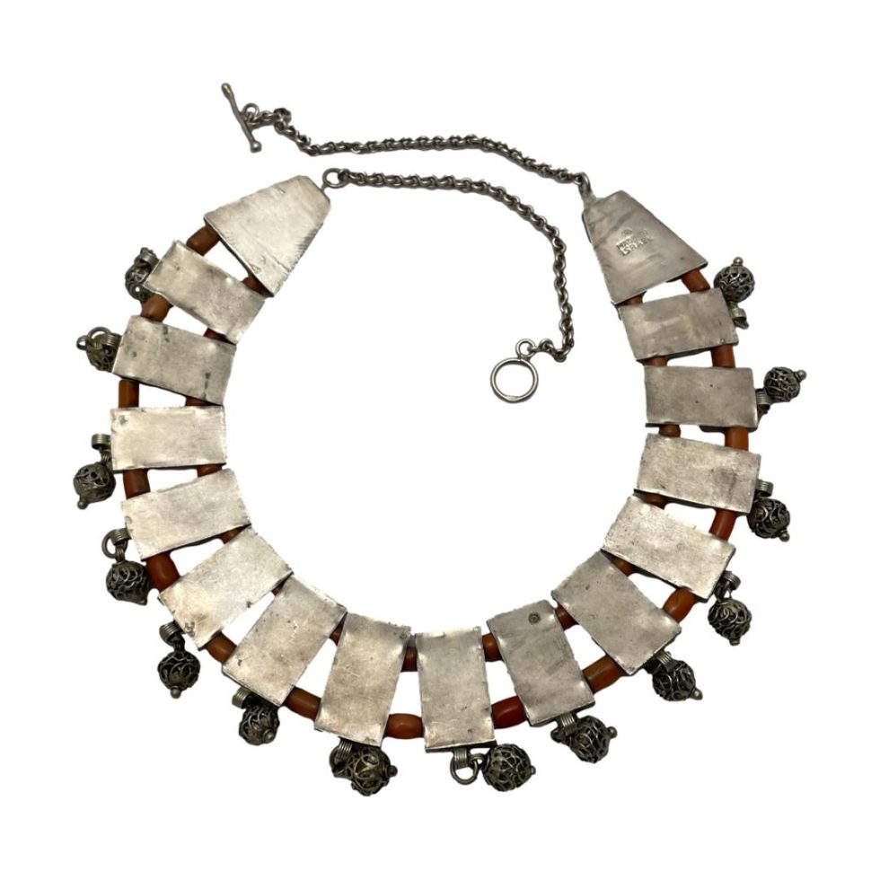 Silver collar necklace marked Ag. Beautiful collar necklace with rectangular silver panels each embellished with 2 small turquoise stones and a small silver filigree ball hanging from the ends. Each panel is separated by 2 coral beads, short to the top and longer at the bottom to create the rigid U shape of the collar. Possibly a bridal piece. Hallmarked Ag to the clasp ring and marked 930 made in Israel to back of one end panel. Measures approximately 400mm long. One panel length with end ball measures approximately 35mm.