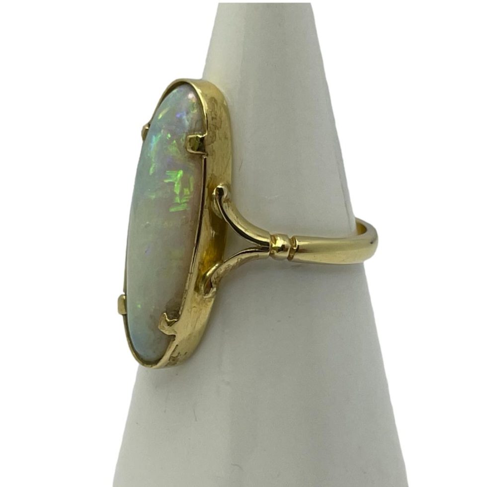 Antique 18 karat gold and opal ring. c1900 ring with a generous sized lively oval opal set on 18 karat gold. Hallmarked 18ct to the inside band. Opal measures approximately 25mm long by 10mm at widest. Ring size N / 6.5. Weight 5.1grams.