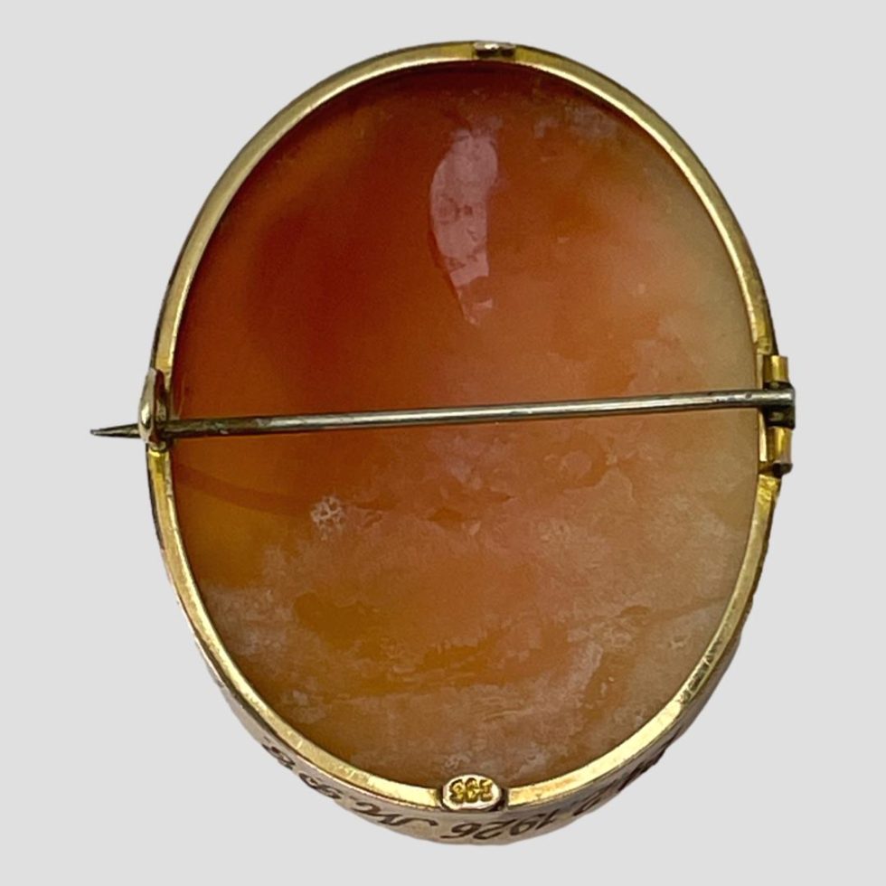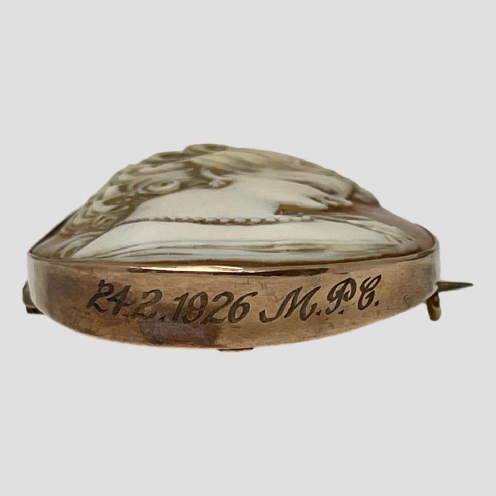 Antique cameo brooch set in 9 karat rose gold. A beautifully detailed, intricately carved antique shell cameo set within 9 karat rose gold which compliments the cameo perfectly . There is some personalisation to the gold frame ‘Dreamy’ along the top and 24.2.1926 M.P.G. along the bottom on the gold frame. Hallmarked 9ct. The pin is not gold.