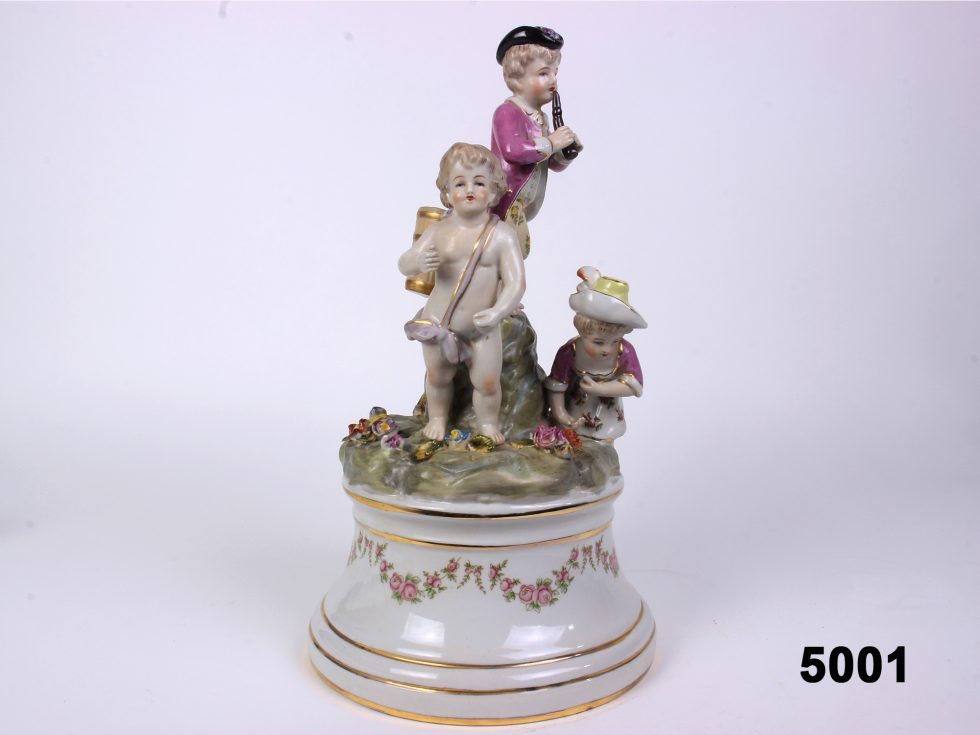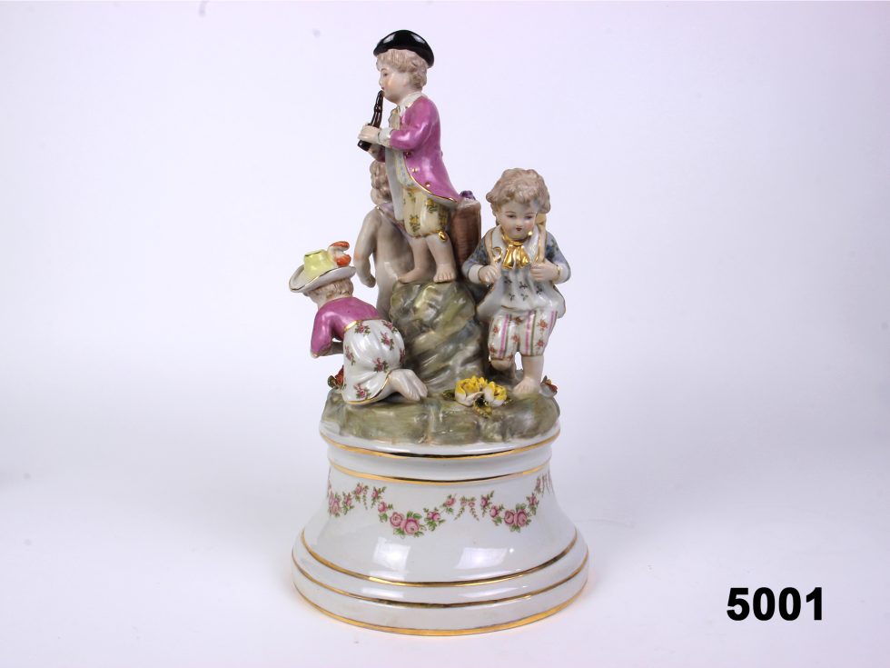 The antique German porcelain figurine is a delightful ornament that depicts four sweet children playing with their toys in a garden setting. The ornament is on a plinth, adding elegance and stature to the colourful piece. To care for the antique German porcelain figurine, we suggest dusting it with a damp cloth occasionally to maintain its condition.