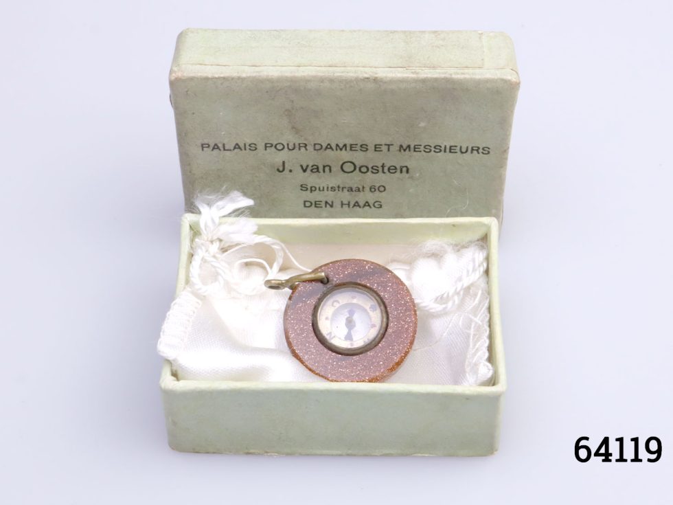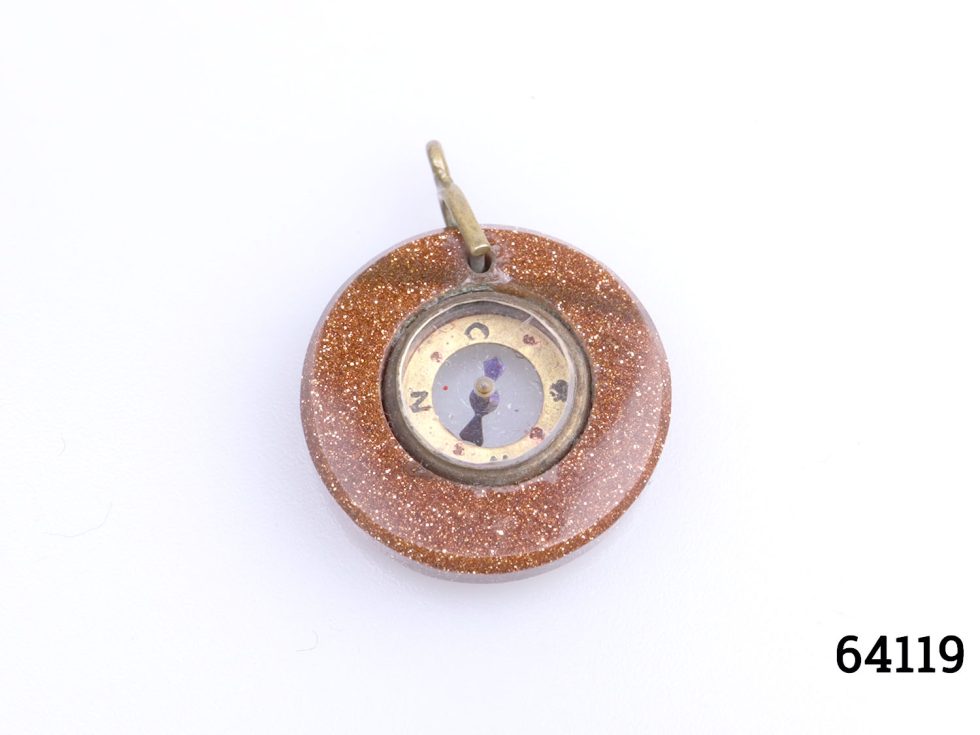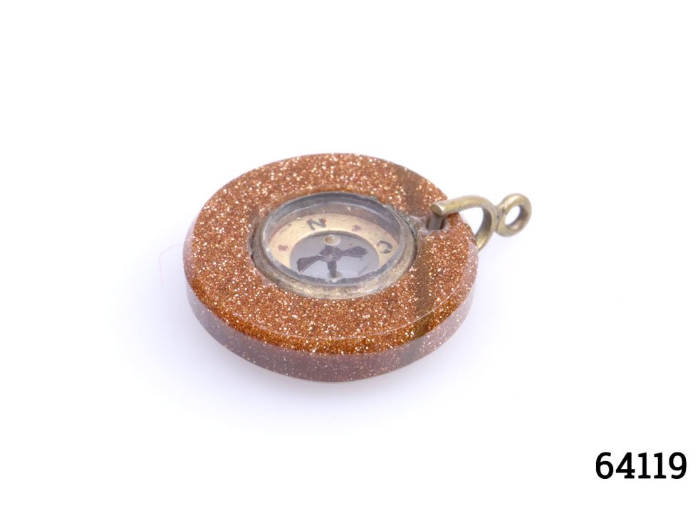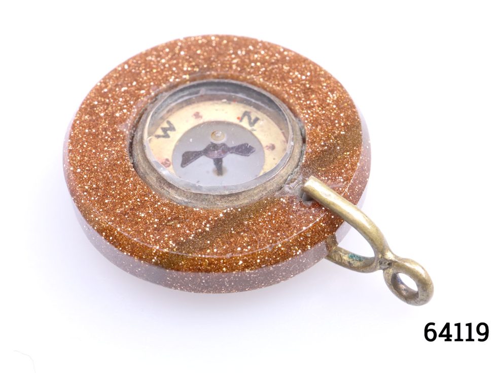 The antique goldstone compass fob is a miniature compass in a circular piece of sparkly goldstone and it is a very unusual little item. The antique goldstone compass fob would look well on a suitable chain in either gold or a thin ribbon to enhance its rare beauty. The compass fob would make an ideal gift for the person who has everything! To care for the fob just gently polish it with a soft cloth.