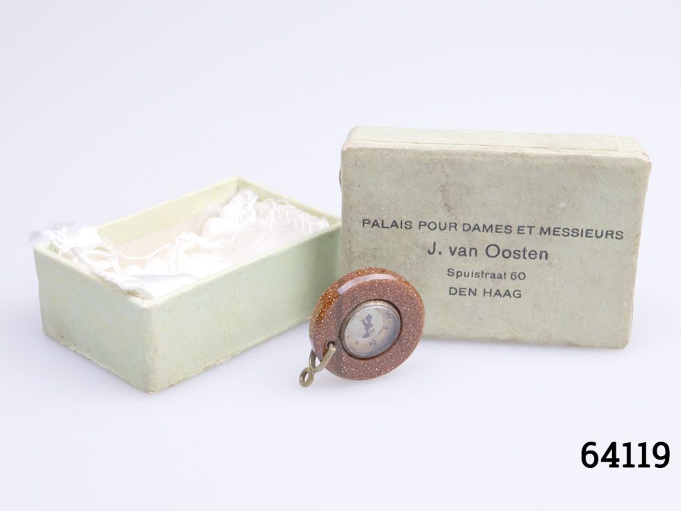 Antique goldstone compass fob. Miniature compass set in a ring of sparkly goldstone and mounted on brass. Comes in box and pouch.