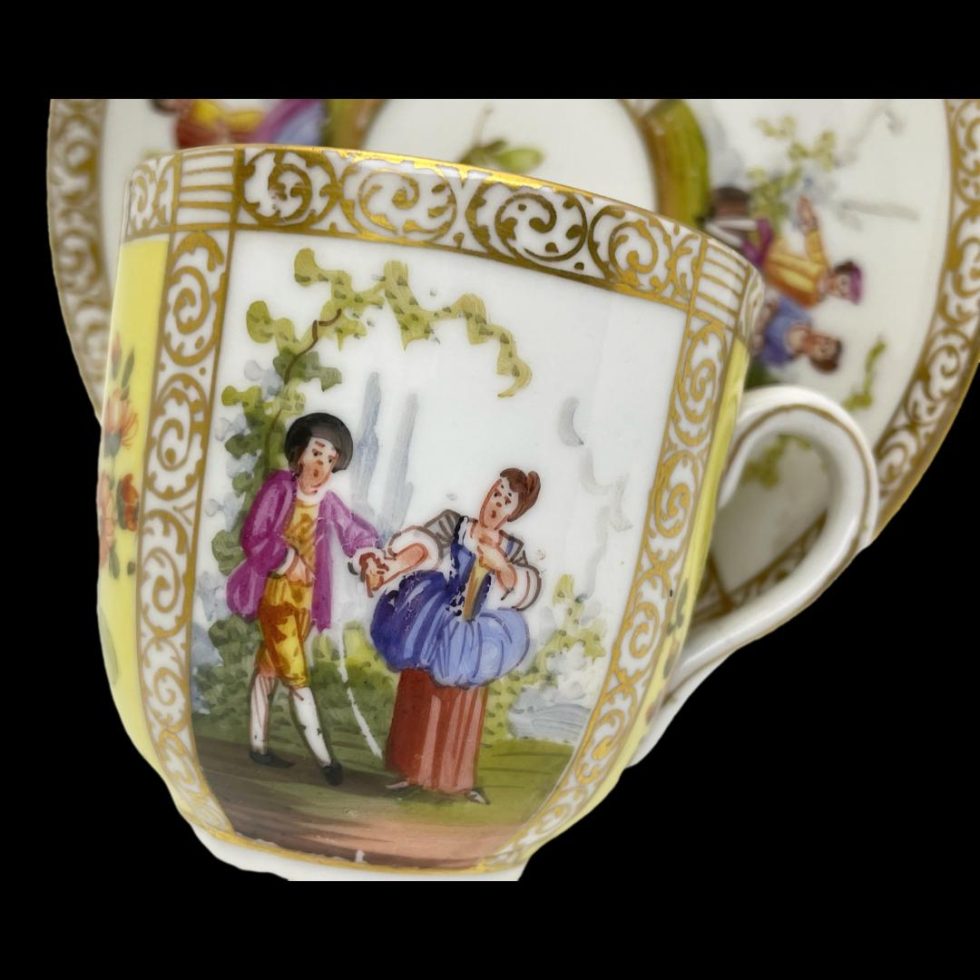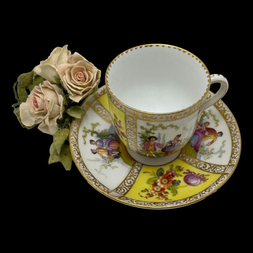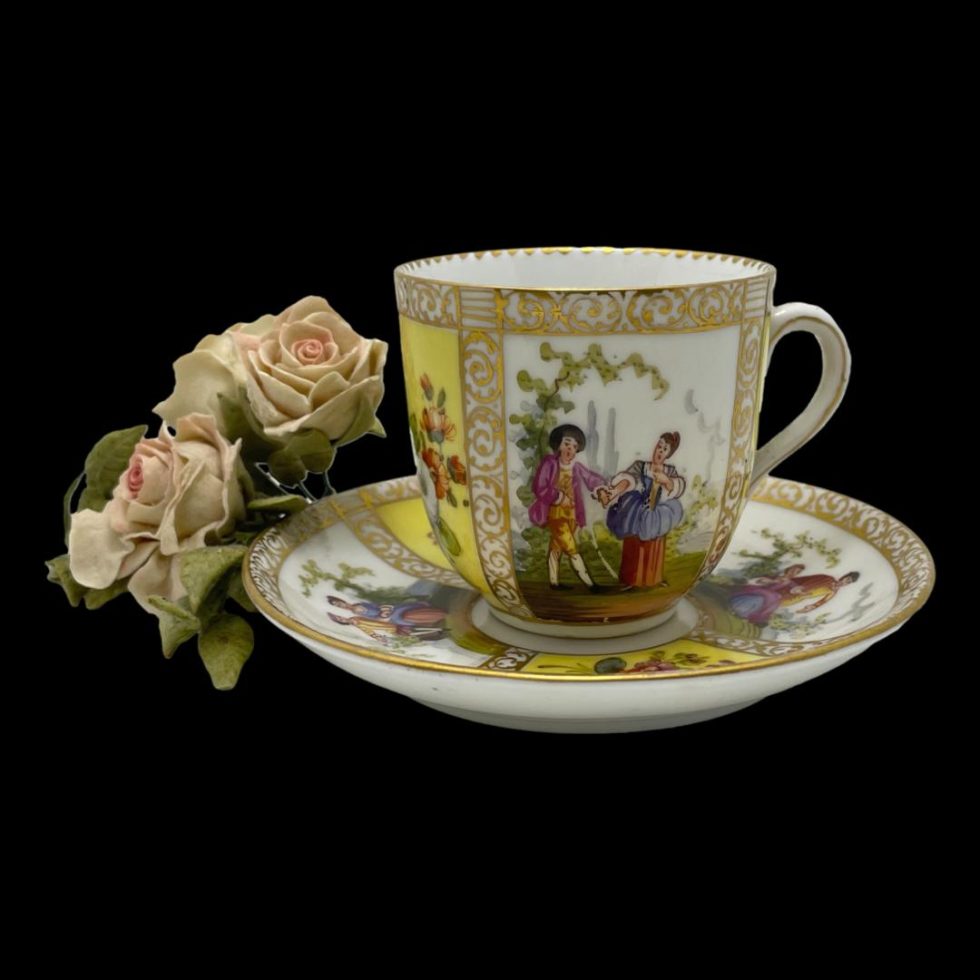 Antique hand-painted cup & saucer by Dresden. Beautiful hand-painted porcelain cup and saucer by Dresden, Germany c1890. 4 panels show a romantic couple in different scenes of courtship whilst other 4 are various wild flowers against a yellow background. Finishes in 24 karat gold trim. Signed to the base. In very good condition with no chips, cracks or crazing and only very minimal gilt wear. Cup measures 36mm in diameter at base, 66mm across top, 85mm at widest and 62mm tall. Saucer measures 75mm in diameter at base, 122mm across top and 20mm depth.