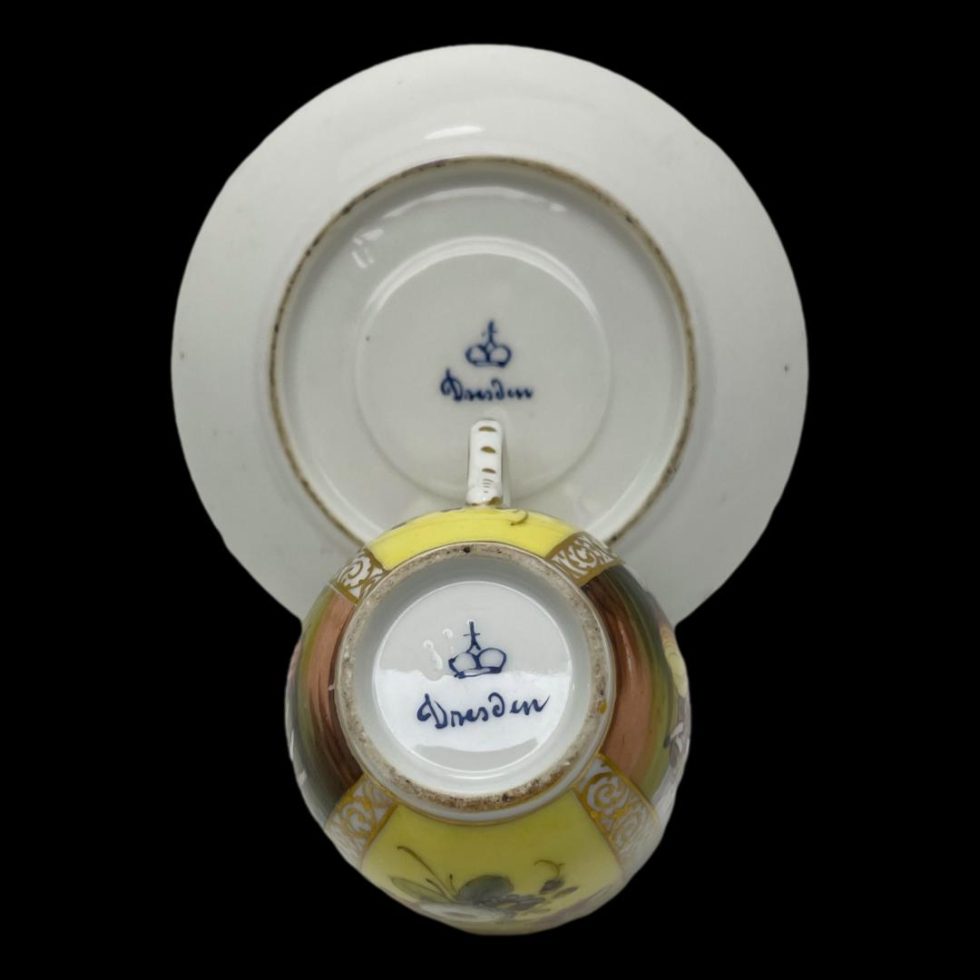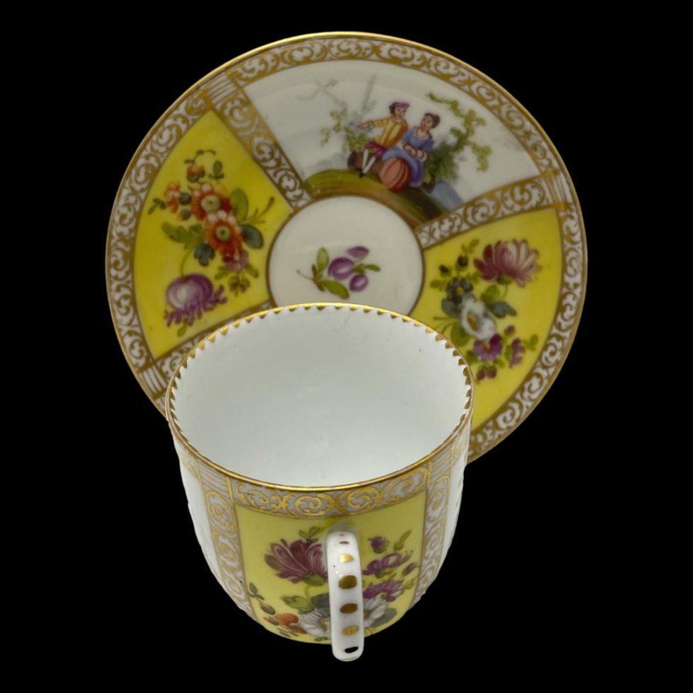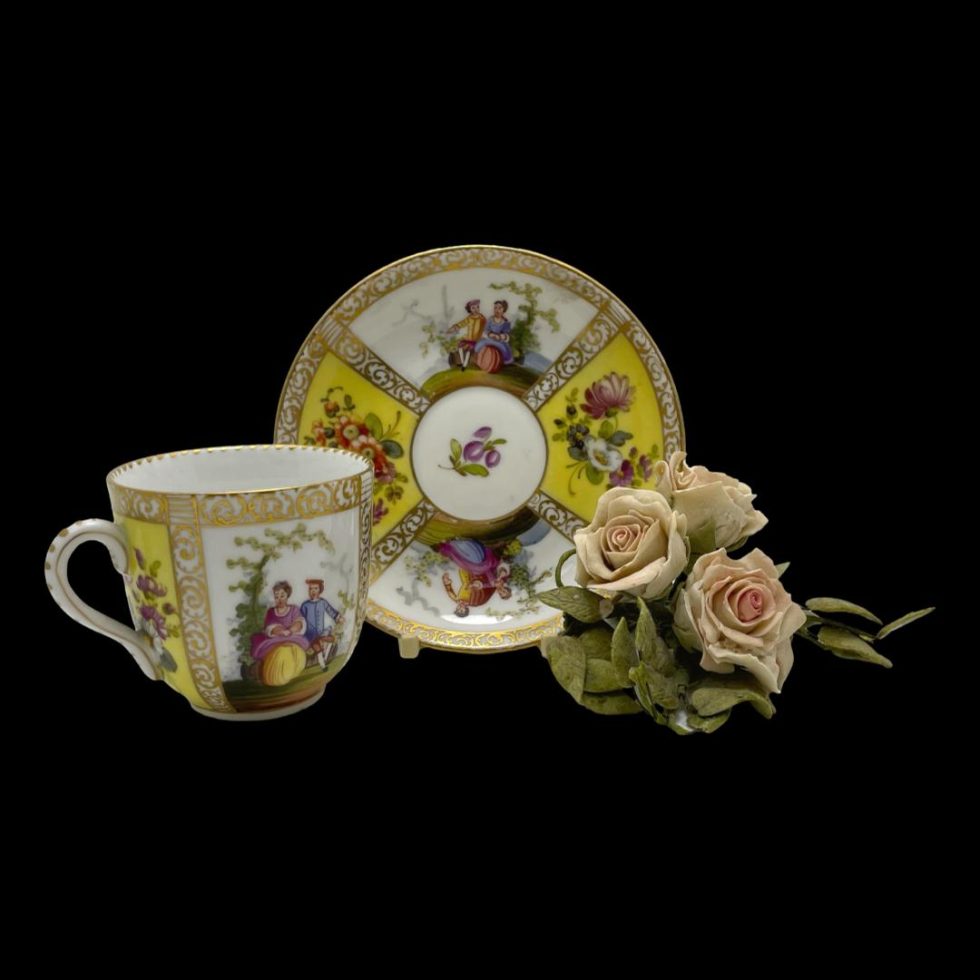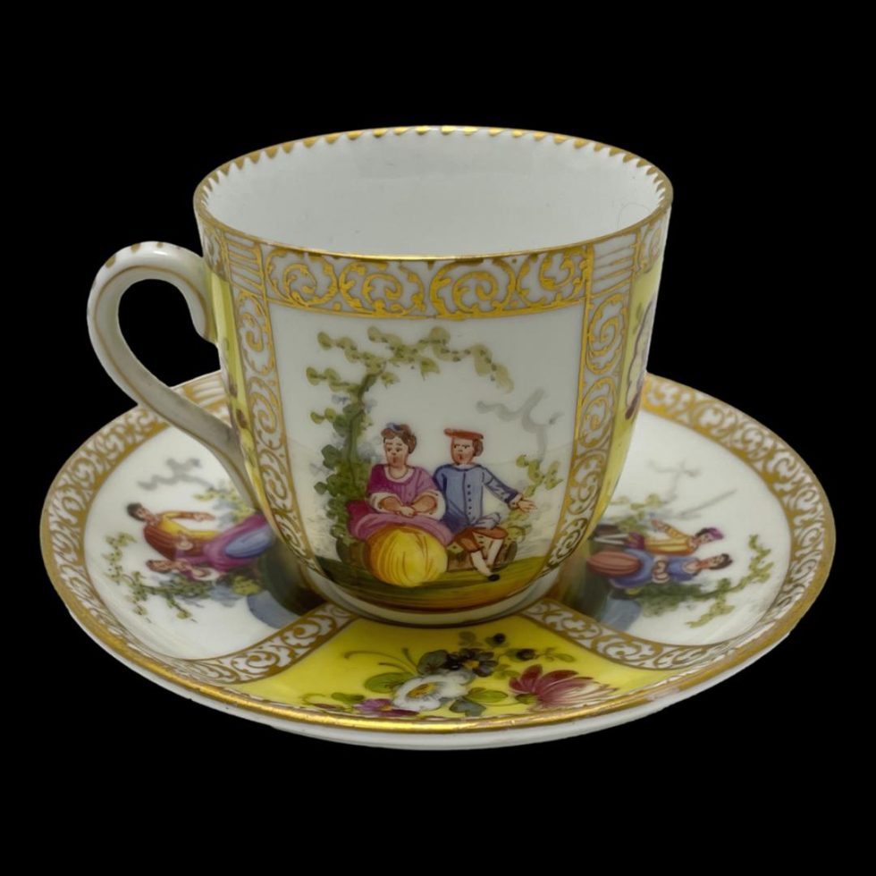 Antique hand-painted cup & saucer by Dresden. Beautiful hand-painted porcelain cup and saucer by Dresden, Germany c1890. 4 panels show a romantic couple in different scenes of courtship whilst other 4 are various wild flowers against a yellow background. Finishes in 24 karat gold trim. Signed to the base. In very good condition with no chips, cracks or crazing and only very minimal gilt wear. Cup measures 36mm in diameter at base, 66mm across top, 85mm at widest and 62mm tall. Saucer measures 75mm in diameter at base, 122mm across top and 20mm depth.