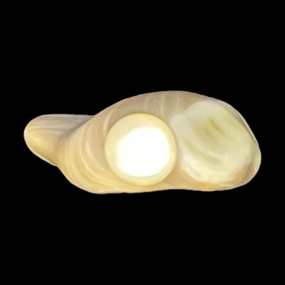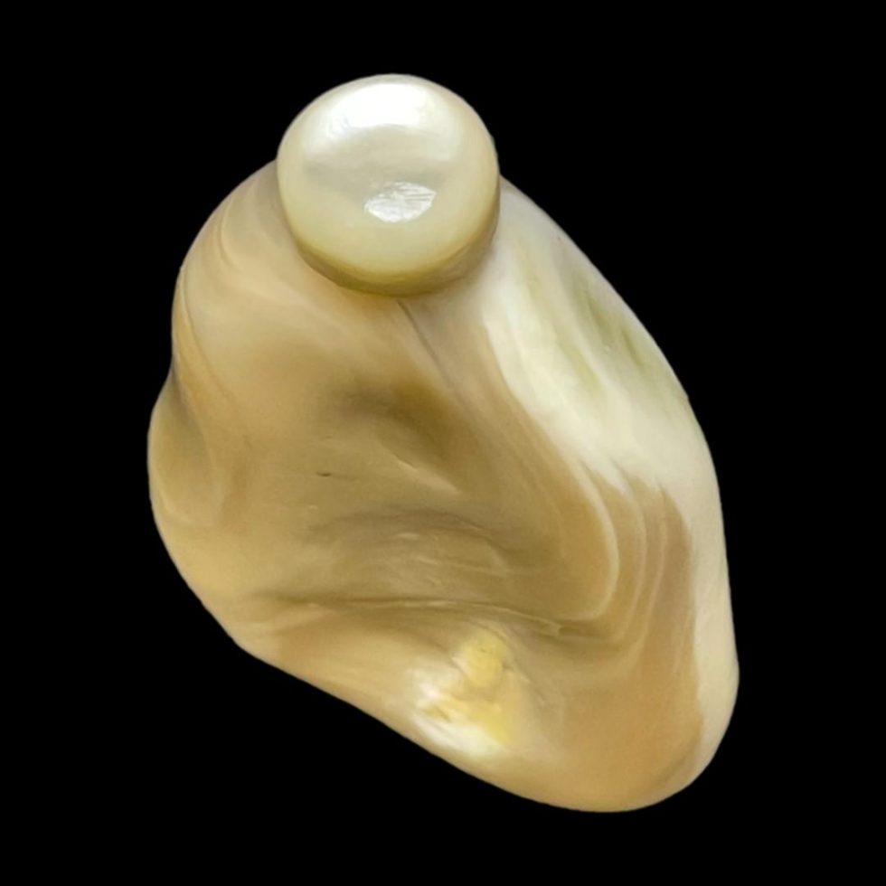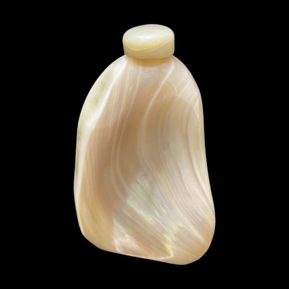 The antique M.O.P. snuff bottle features a piece of mother-of-pearl in the form of a snuff bottle and a small spoon.