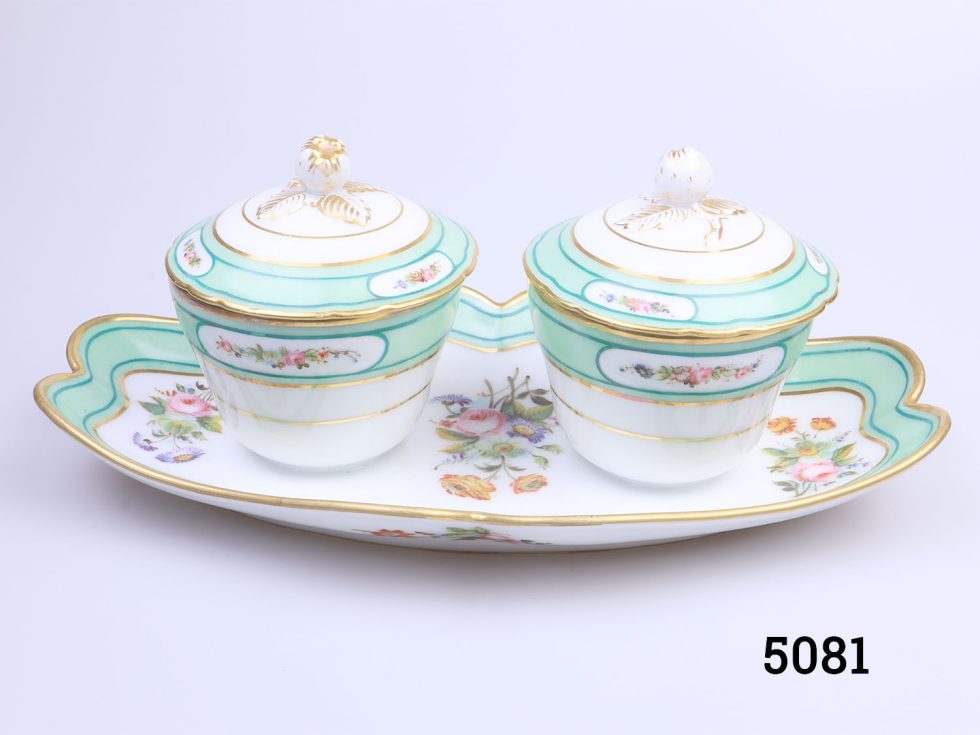 Antique 19th century Paris porcelain double condiment pots on a tray. Identical sized lidded condiment containers attached to a decorative tray. Floral design with peppermint green and gilt. In excellent condition throughout with minor marks inside the pots only.