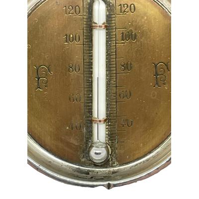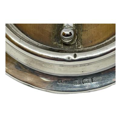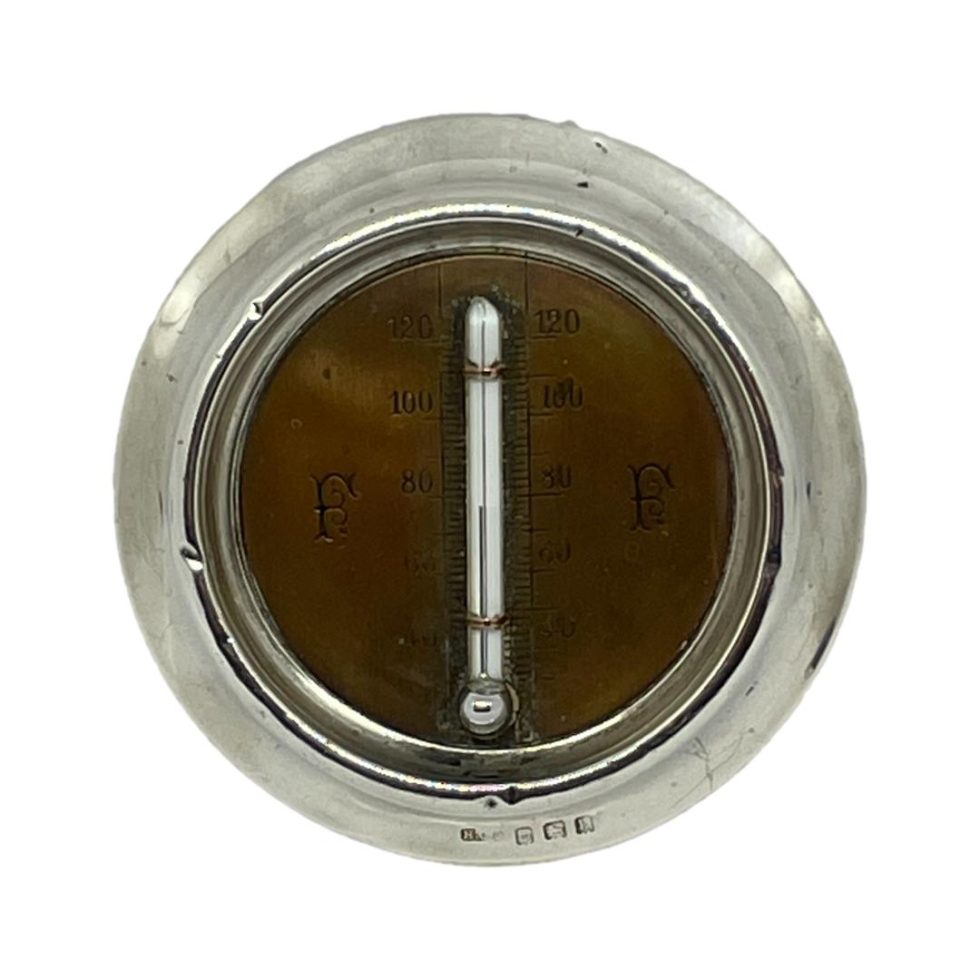 Antique sterling silver desk top thermometer paperweight. c1909 mercury filled desktop Fahrenheit thermometer with brass face within a sterling silver frame. Some dinks to the silver frame especially around the top. Hallmark to outer rim of frame for Birmingham assay and made by Henry Clifford Davis. Measures 82mm in diameter at base, 67mm at top and thermometer face measures 55mm.