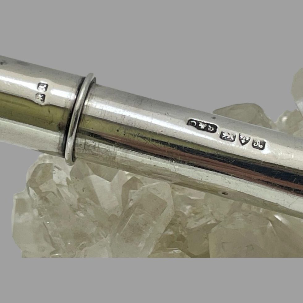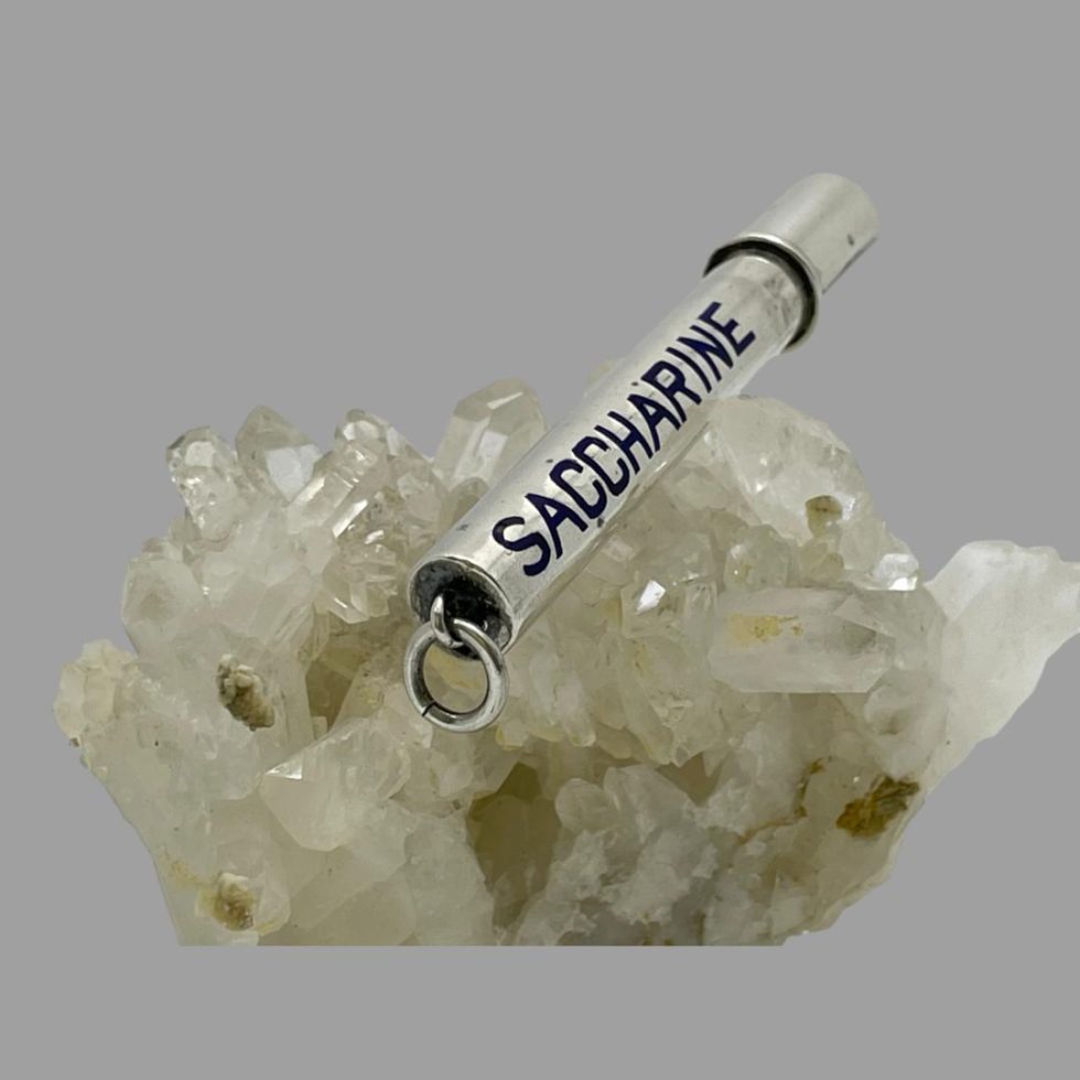Sterling silver container tube for storing saccharine. An interesting item dating from 1901 which is the year Monsanto was founded to produce saccharine in America. This piece is fully hallmarked for Chester assay c1901. The makers initials are difficult to decipher but most probably Rosen & Alexander. Can be used to store any number of things from a small pencil, cigar or an emergency stash of cash amongst others. Measures approximately 8mm in diameter on the inside with drop length of 90mm. Weight 20grams.