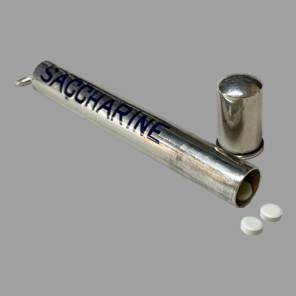 The antique silver saccharine container tube, dating back to 1901, features a cylindrical tube for storing saccharine. It has a hallmark for Chester in 1901.