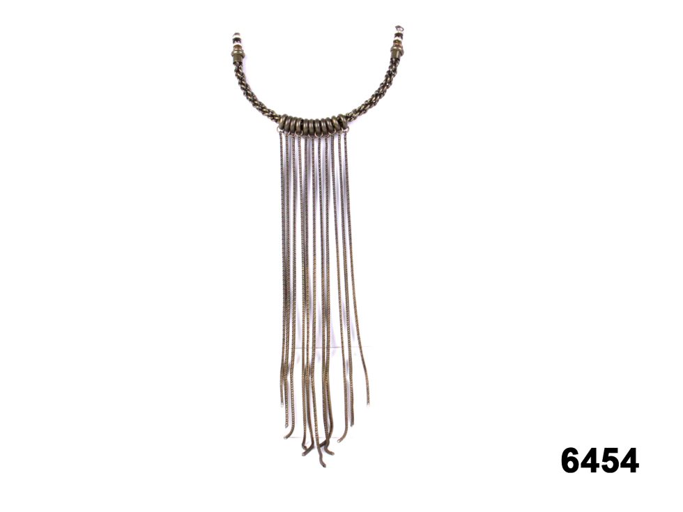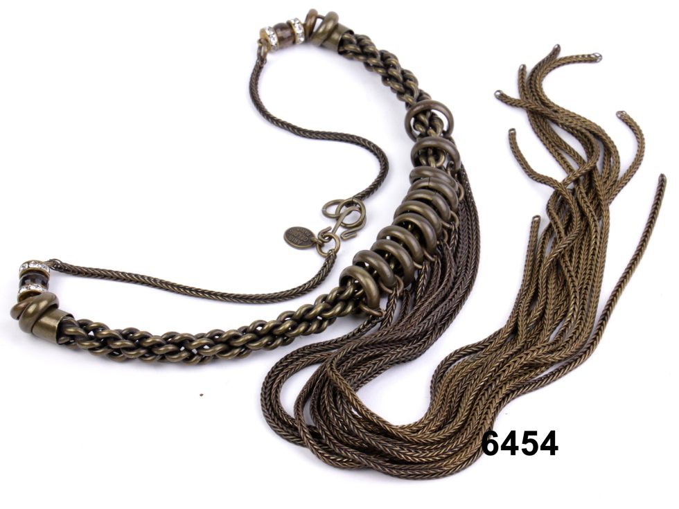 The Aris Geldis necklace is a bronzed metal necklace with smoky quartz and cubic zirconia accents. The necklace has long tassels in metal and has the look of bohemian retro jewellery. The longest tassel on the necklace is 300mm long so quite a statement piece of jewellery to add to your collection. To care for the Aris Geldis necklace use a soft cloth and gently polish it when necessary.