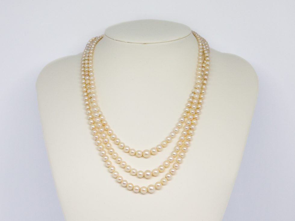 The Art Deco graduated pearl necklace is a lovely example of quality jewellery at its best. The necklace features three rows of graduating beautiful pearls that are in great condition featuring a silver metal clasp with paste stones decorating the top. The pearls would display well on the neck with a low-cut evening gown enabling the beauty of the necklace to shine and shimmer. To care for the Art Deco graduated pearl necklace, we suggest a light polish with a soft cloth occasionally.