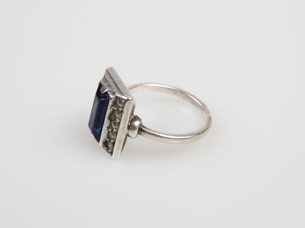 The art deco 935 silver ring has a rectangular shape with a royal blue glass stone in its centre. The ring size is M.5/6.5. The pretty ring has a vintage look and would enhance an existing jewellery collection. To clean the art deco 935 ring gently wipe it over with a soft cloth when required.