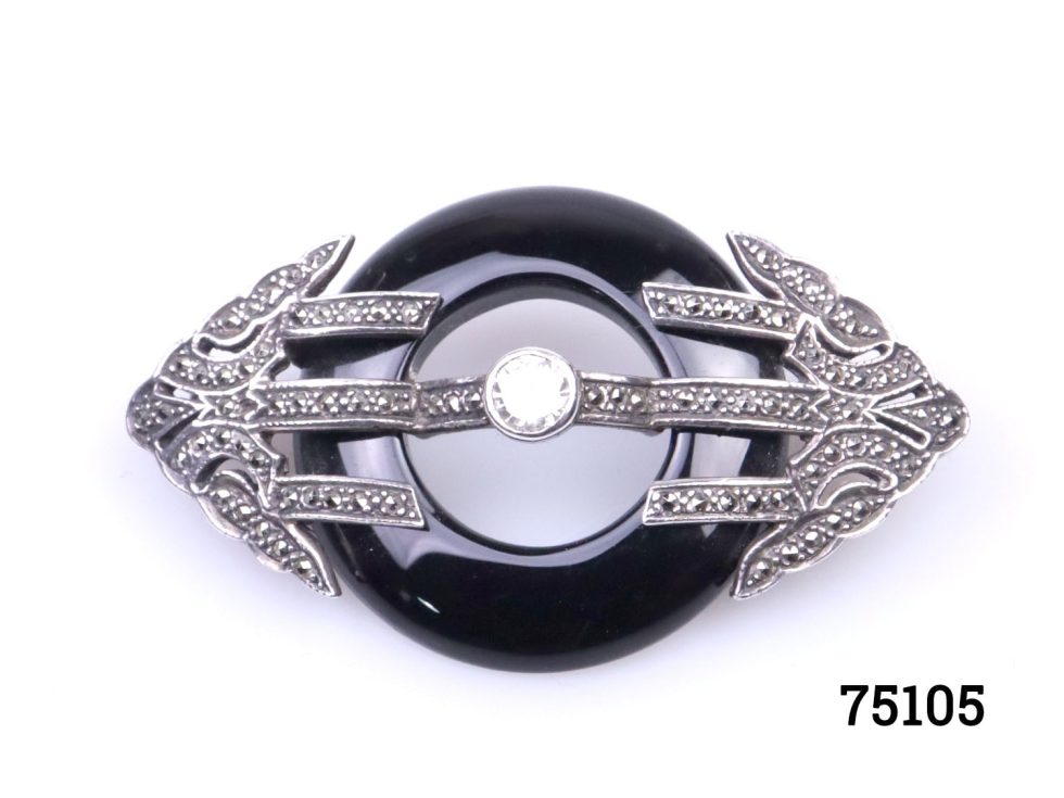 Art Deco style sterling silver and marcasite brooch with a ring of jet to the centre. Will be sent boxed.