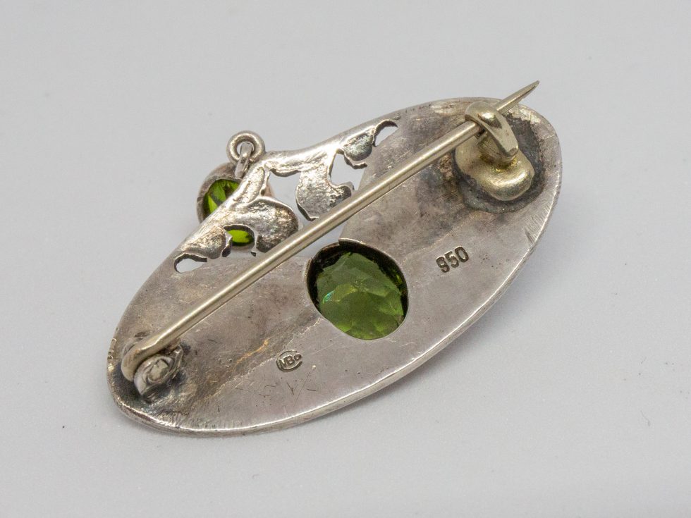 Murrle Bennett brooch in 950 grade silver and peridot. Fine Art Nouveau brooch by Murrle Bennett & Co in a classic Art Nouveau design with 2 oval cut peridot stones. Hallmarked to the back.