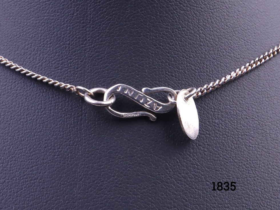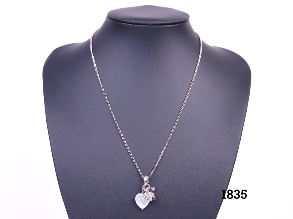 The Azuni sterling silver necklace has a hallmark of London 2006 and is the work of the maker known as Azuni. The necklace features a pearlised heart with silver leaves and a crystal glass bead charm all hanging on a sterling silver chain. The necklace would display well on an open-neck blouse or shirt to show off its charm and beauty. To care for the Azuni sterling silver necklace, we suggest polishing it with a soft cloth when required.