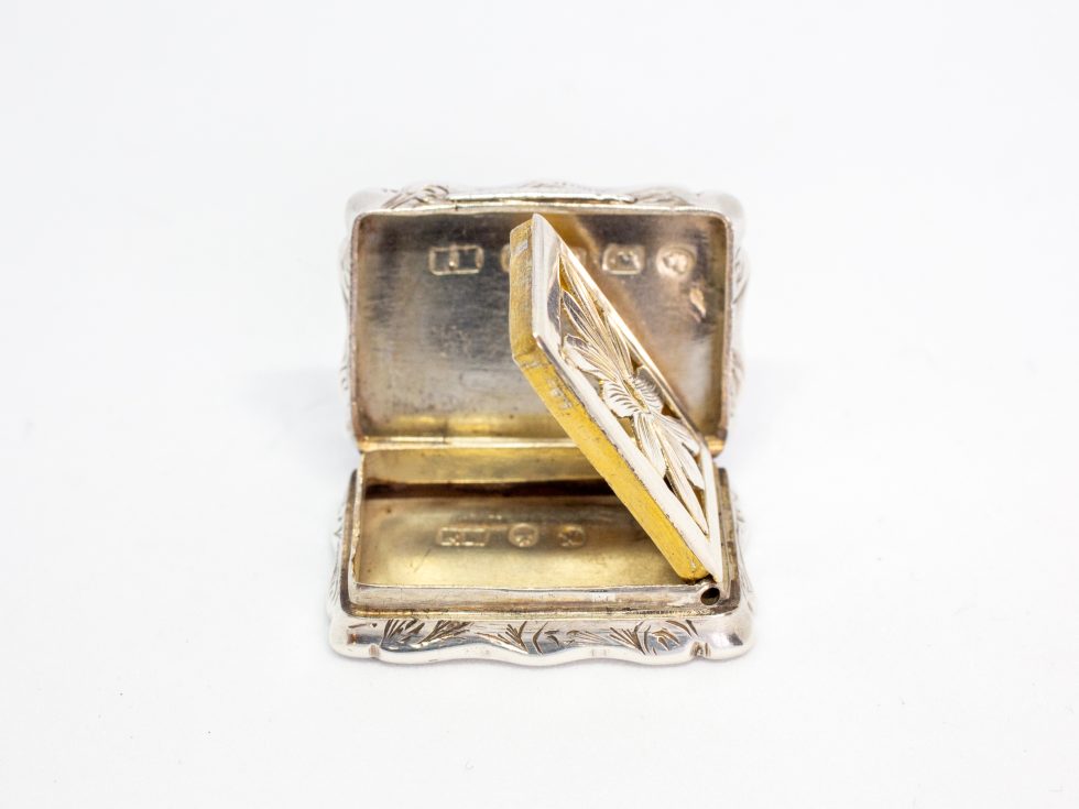 c1872 Victorian sterling silver vinaigrette. A sweet rectangular vinaigrette decorated on both sides with a vacant cartouche for personalisation. A flower decorates the inner grille. Fully hallmarked to the inside lid as well as lower section. Assayed in Birmingham by Frederick Marson. In excellent condition.