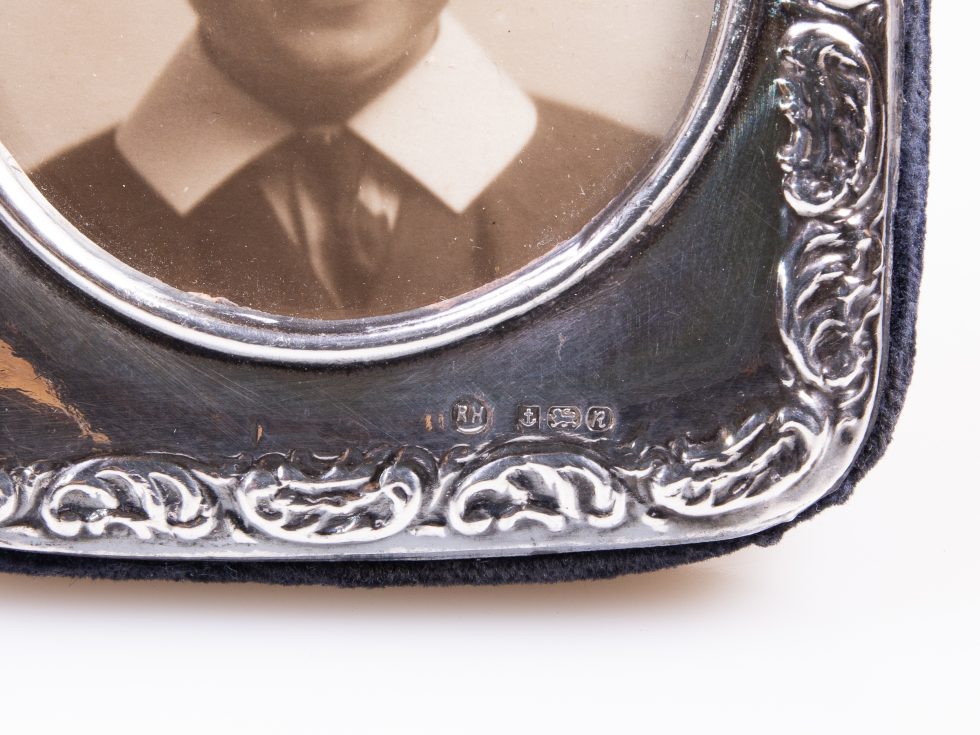c1991 Birmingham assayed sterling silver photo frame. Small photo frame in an antique style with circular photo image to centre. Navy blue velvet to sides and back with brass.