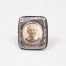 c1991 Birmingham assayed sterling silver photo frame. Small photo frame in an antique style with circular photo image to centre. Navy blue velvet to sides and back with brass.