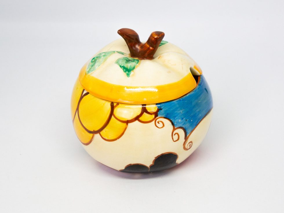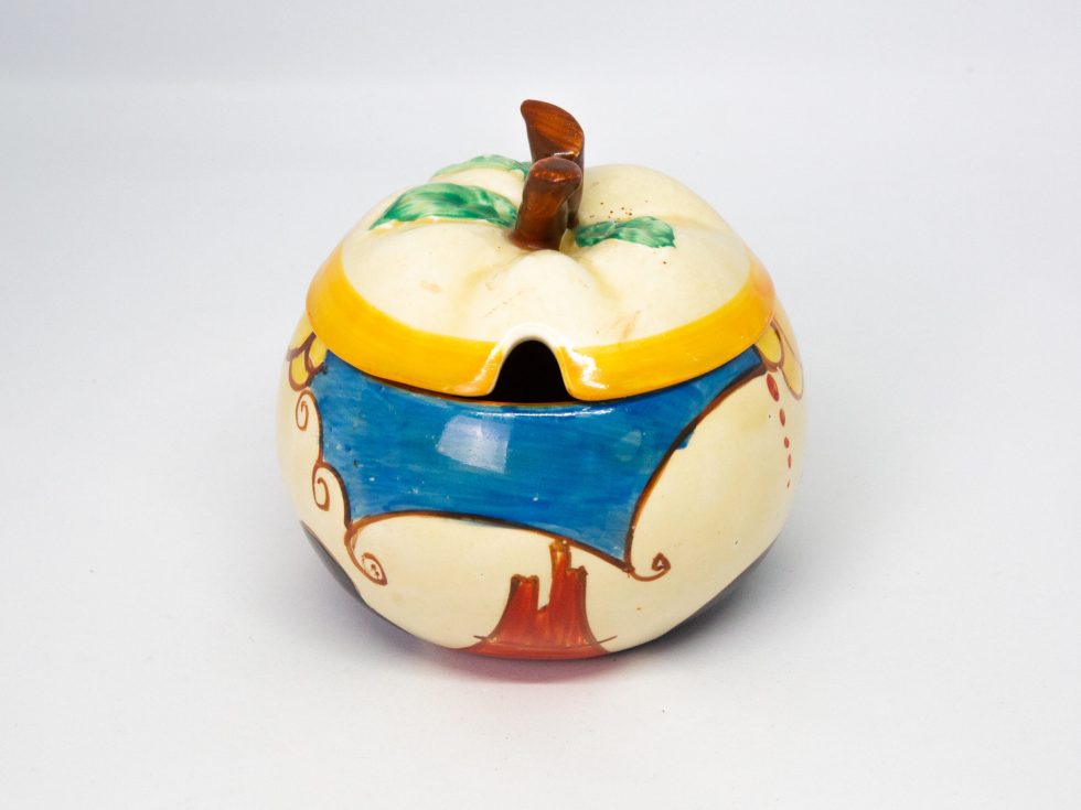 Apple shaped preserve pot by Clarice Cliff. A fun, funky hand-painted preserve pot in the Fantasque Bizarre line, ‘Summerhouse’ pattern. In excellent condition. Signed to the base. c1931-1933.