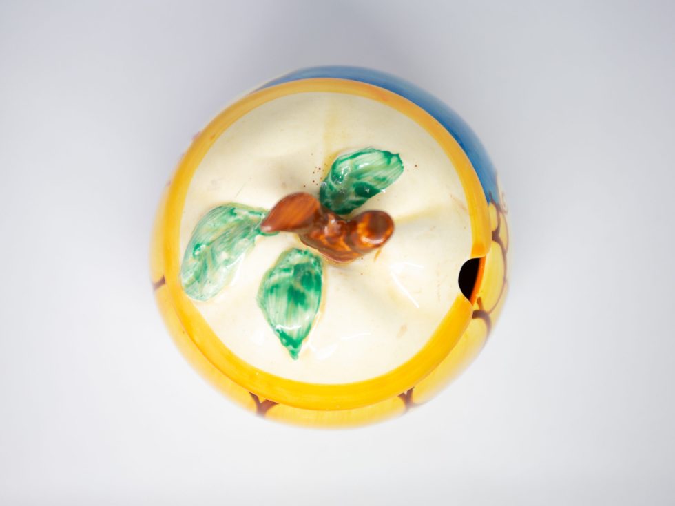The Clarice Cliff apple shape preserve pot is a lovely vintage item from the 1930s that features a wonderful multi-colour pattern in the bizarre range namely ‘Summerhouse’. The little pot is in great condition and is ready to display on your dining table for a special occasion. The collectable Clarice Cliff apple-shaped preserve pot would require little maintenance other than a gentle wash in soapy water and drying thoroughly.