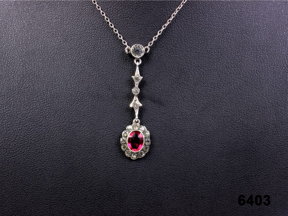 The Edwardian silver necklace lavalier is a stunning piece of antique jewellery at its best. The necklace features a continental silver chain and a silver pendant hanging centrally with a single red stone in a pretty daisy setting. Above the central red stone, there is a series of clear sparkly stones that add glamour and class and complete the classic look. To care for the Edwardian silver necklace lavalier, we suggest a light polish with a lint-free cloth occasionally to maintain its sparkle.