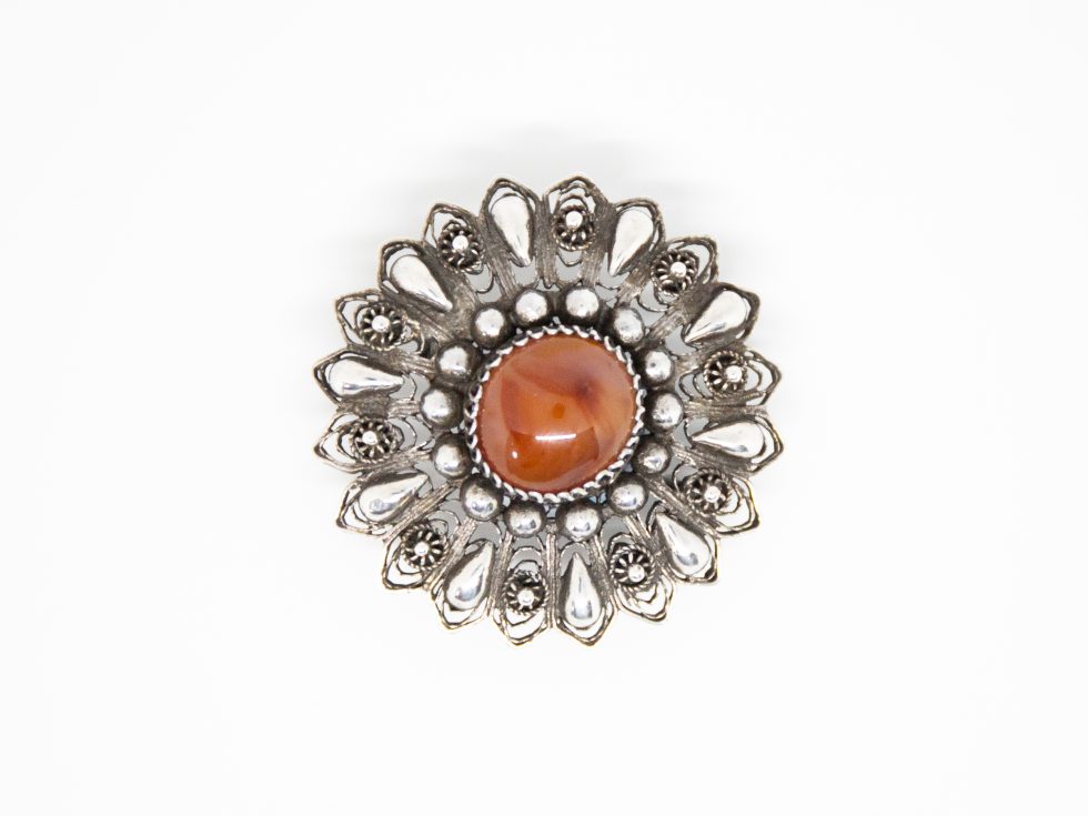 Egyptian silver brooch set with a carnelian to the centre. Intricate design of filigree work integrated with silver globules. Hallmarked to the pin.