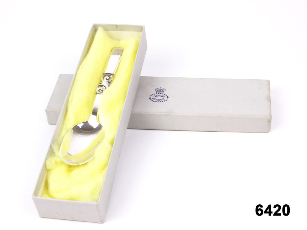 The Georg Jensen silver spoon has an assay mark for sterling silver. The spoon has decoration on its shaft with the bowl having clean lines. The Georg Jensen spoon is a highly collectable item and would look well with similar silver items. The spoon comes with its original box and only requires a light polish to maintain its beauty.