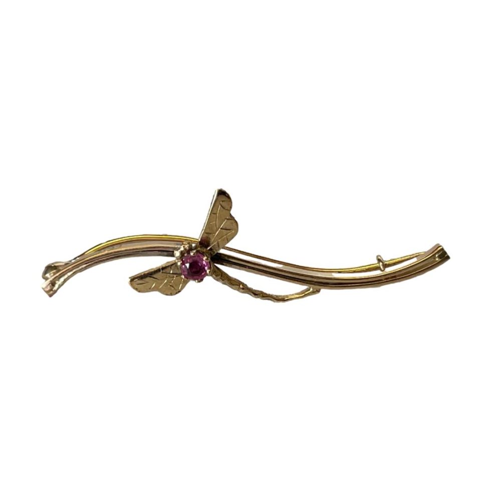 The gold & garnet dragonfly brooch features a 9-karat gold bar with a dragonfly and garnet in its centre.