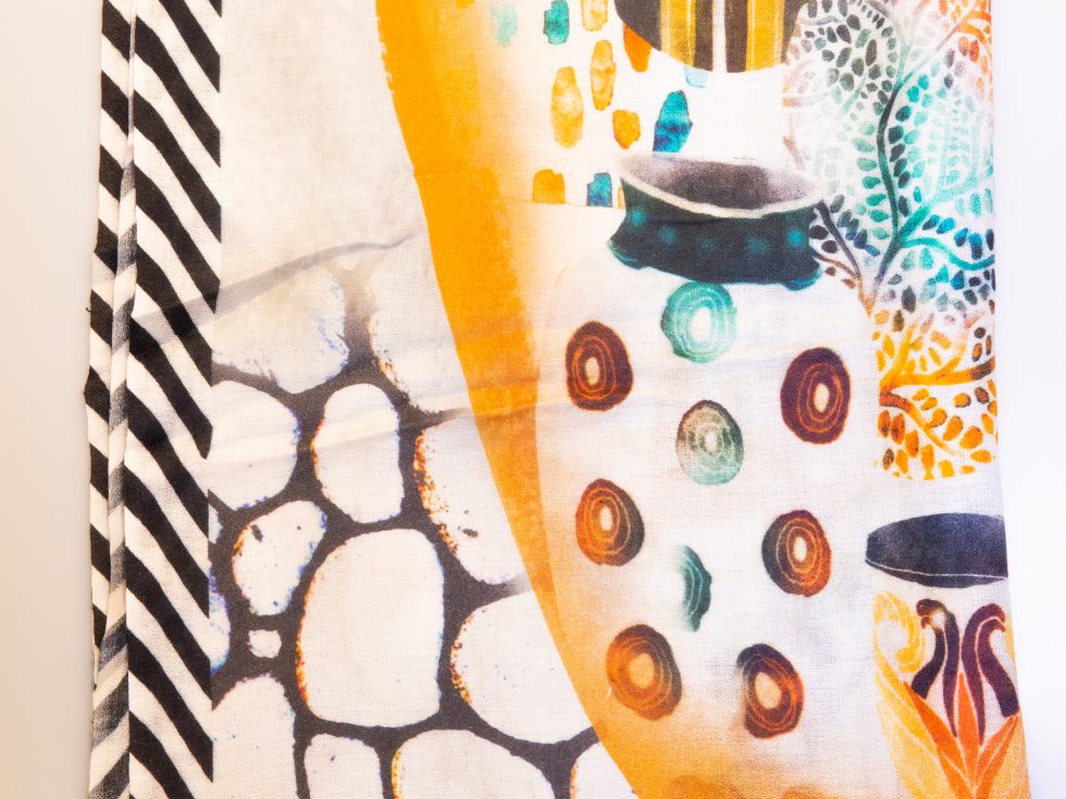 The hand-woven mixed fibre scarf (Pottery) is a unique item with a very soft touch and feel. The scarf features a design of pottery items from a traditional silk screen and lithographic woodblock medium creating a fantastic and luxurious neck scarf. The scarf would be a wonderful gift for that special person in your life who would be delighted to receive such a fashionable item. The hand-woven mixed fibre scarf (Pottery) would require dry cleaning only due to its delicate fabric.