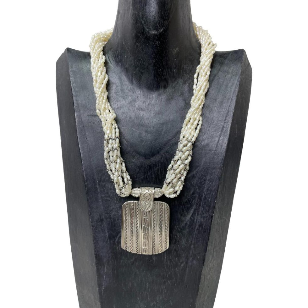 The handmade silver & pearl necklace features six rows of freshwater pearls intertwined with silver balls, with a square silver pendant hanging below.