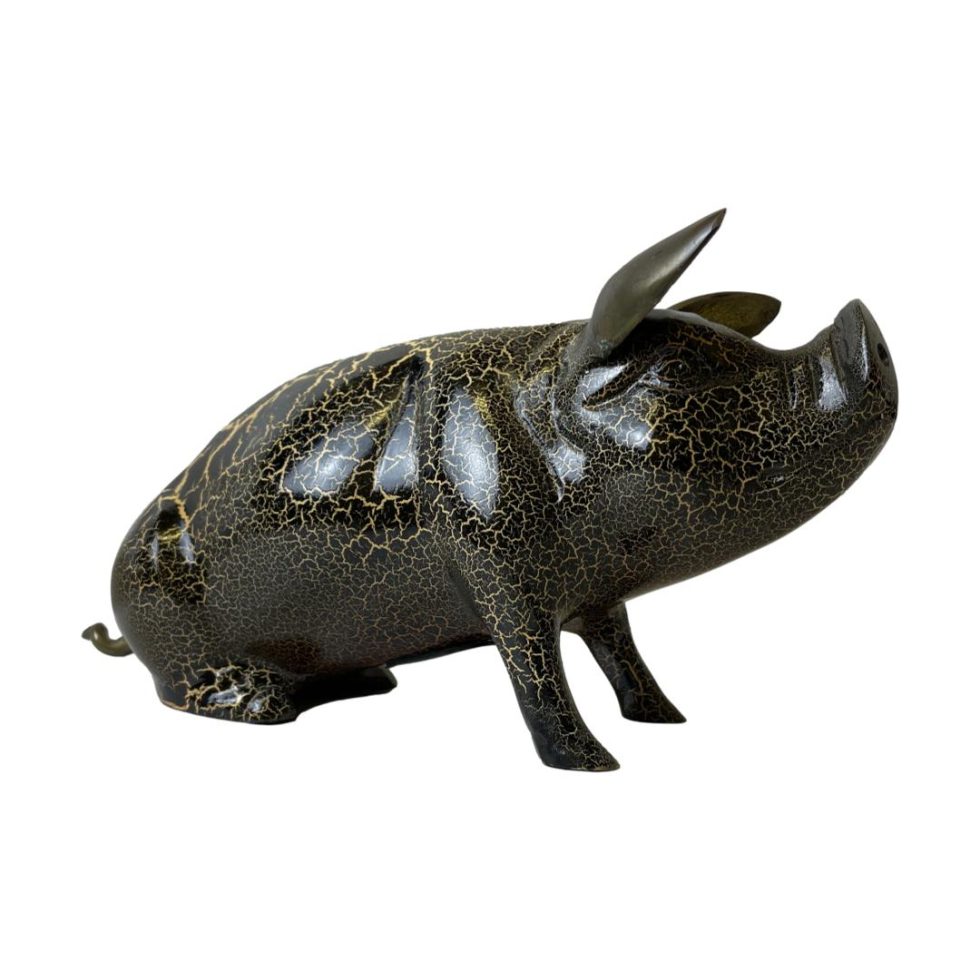 Heavy piggy bank in metal. Cast metal pig money box in gold and black crackle glaze effect and reddish brown to the base. Different glaze effect on each side. Original rubber stopper fits tight.