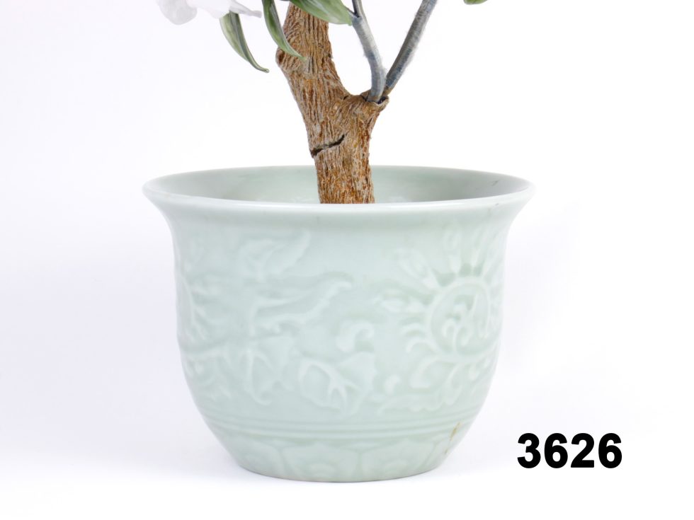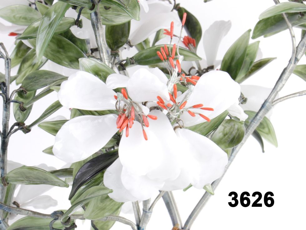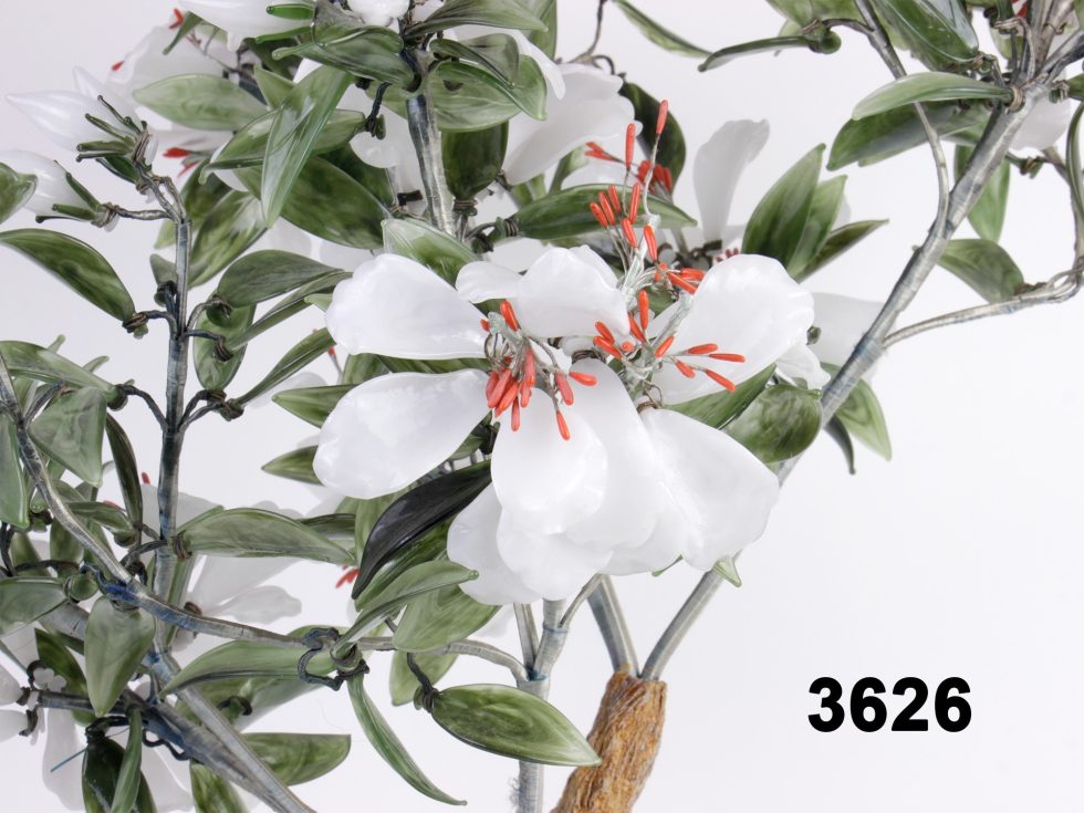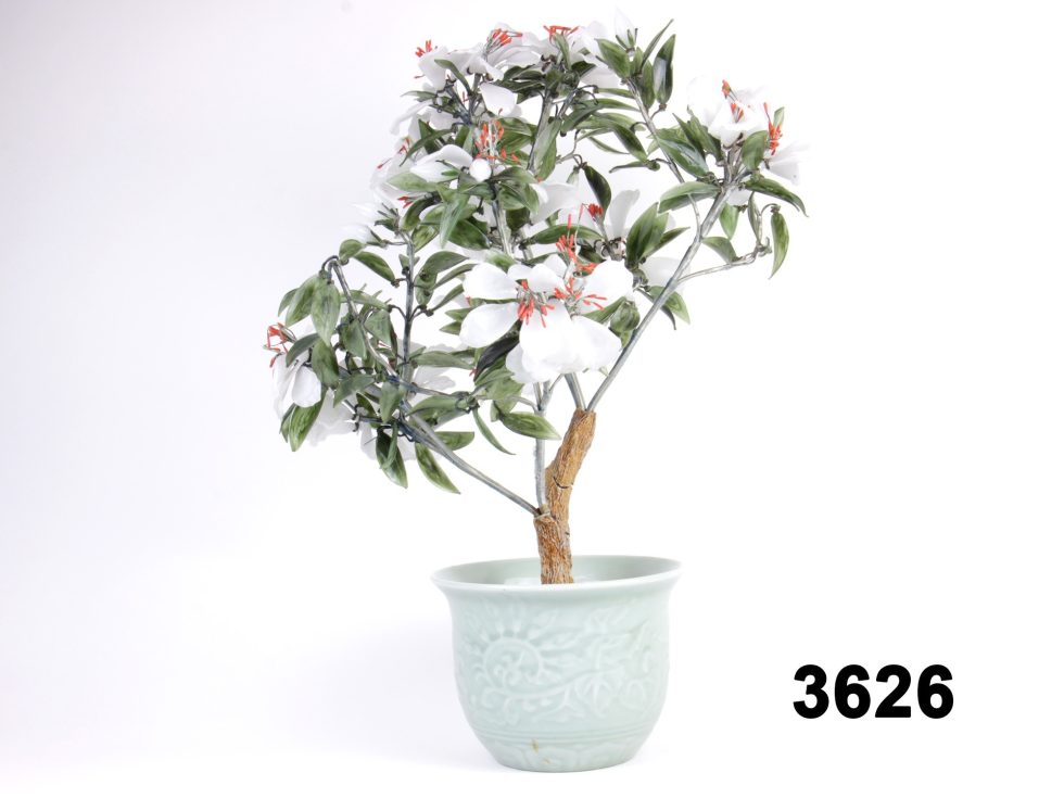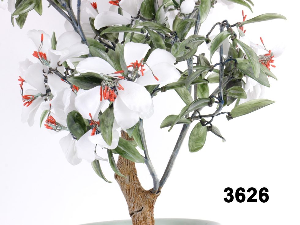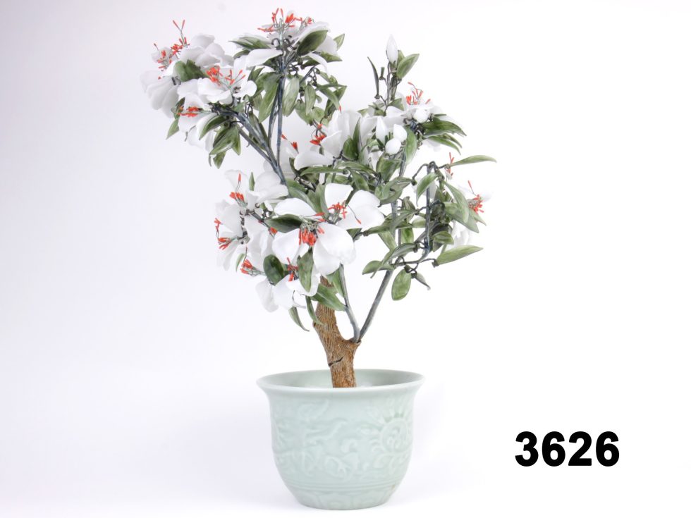 The Jadeite tree is a very attractive ornament in the form of a tree that is full of white flowers with red stamens and green foliage. The tree stands in a small white pot and would display well on a sunny window sill where the sun would highlight its beauty. To care for the Jadeite tree we suggest gently dusting it with a soft cloth when necessary.