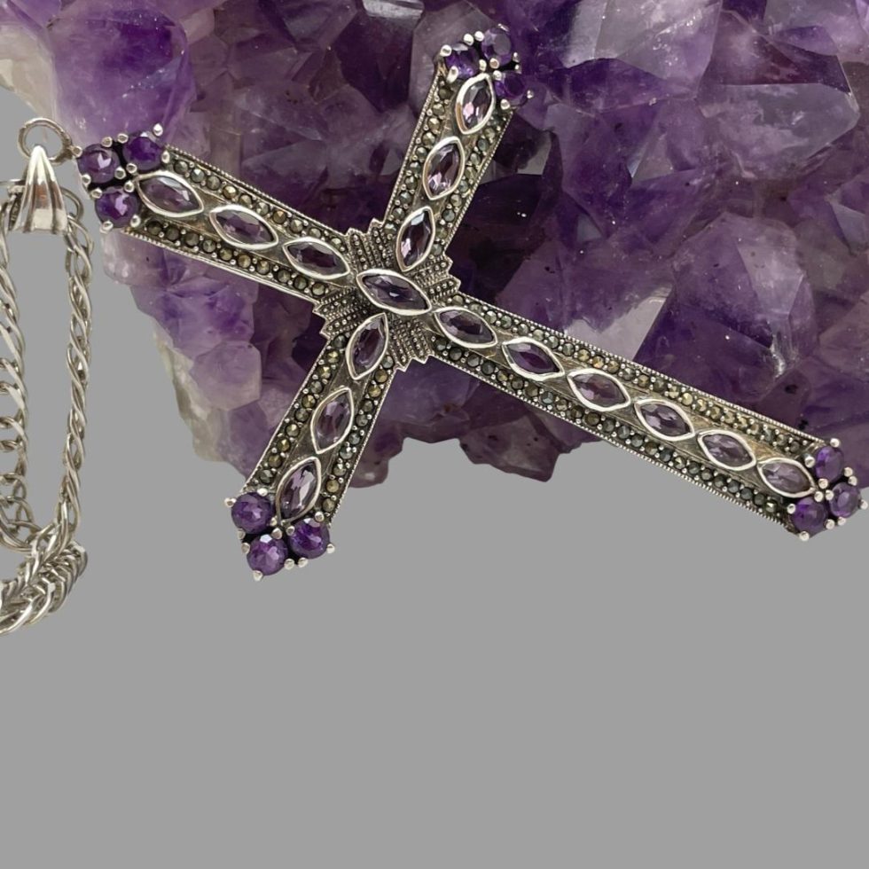 The large silver amethyst cross & chain features a silver cross with a collection of amethysts and marcasite decorating the front.