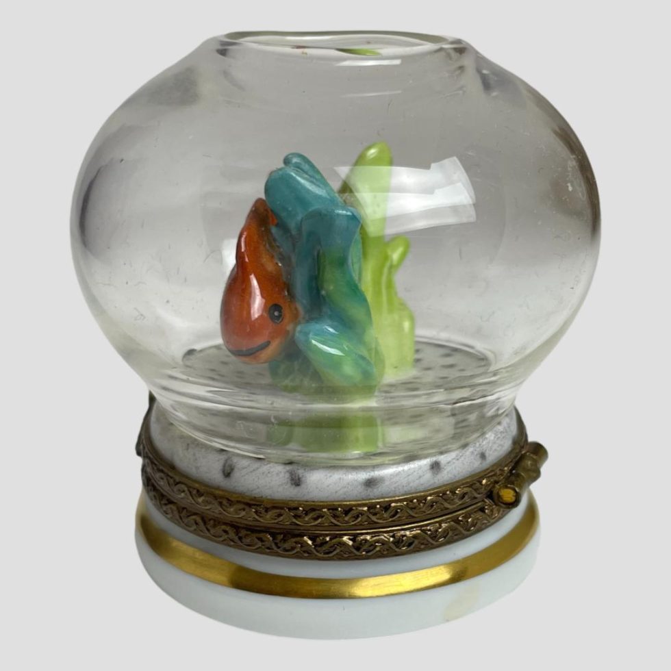 A vintage box in the form of a goldfish bowl by Limoges. A rare handmade and hand-painted goldfish bowl box by Limoges with glass bowl to the top of lid housing a single goldfish amongst seaweeds. The brass edging has a nice touch with a tiny fish at the front and some more seaweed hand-painted to the inside of box. Measures 38mm in diameter at base, the glass bowl is 48mm in diameter at widest and the whole piece measures 48mm tall.