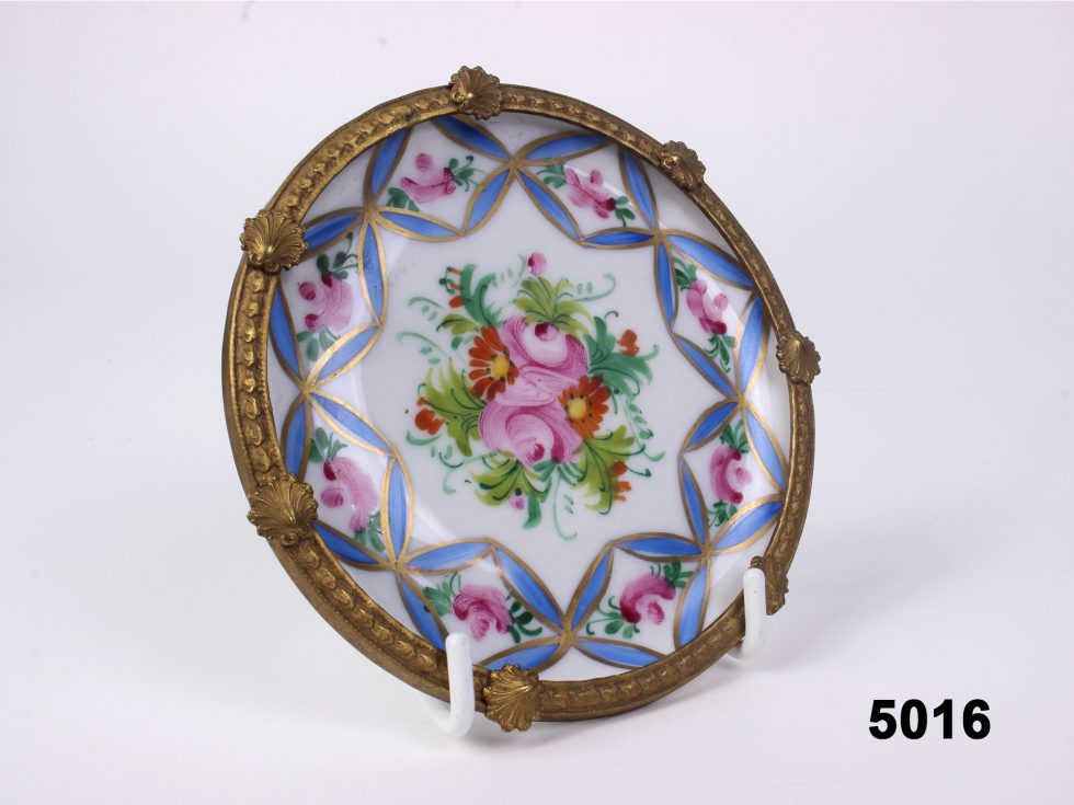 This attractive Limoges porcelain pin dish has a blue and pink floral design on its centre and border. The Limoges pin dish has an unusual brass rim decorating the outside of the dish and a Limoges stamp on its reverse side. This Limoges pin dish would add a touch of vintage elegance to a dressing table or an existing Limoges collection. Clean the dish with a soft cloth when necessary.