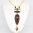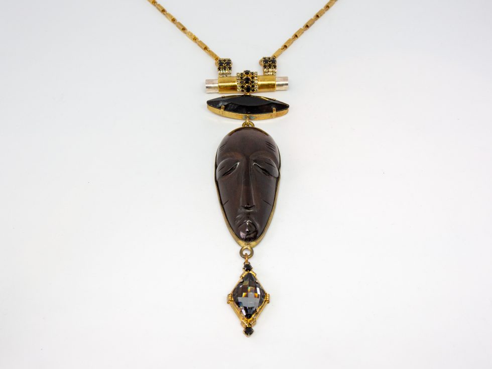 The modern Vicki Sarge designer necklace is an interesting piece of costume jewellery. The necklace features a gold-plated bale with Swarovski crystals adding shine and glamour to the item. Under the bale is a long black wooden pendant in the shape of an elongated tribal face with a fabulous large crystal completing this unique item. To care for the modern Vicki Sarge designer necklace we suggest a light polish with a soft cloth as necessary.