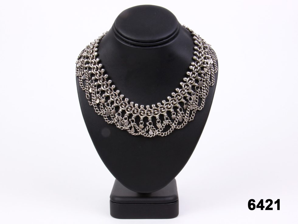 The northern Indian silver choker has intricate decoration throughout and hangs down as far as the collar bone. The necklace originates from Rajasthan which is famous for its ornate jewellery that is a reflection of its royal heritage and rich culture. The fabulous necklace tests as sterling silver but no hallmark is visible and it dates from between 1930-50. The northern Indian silver choker requires little maintenance other than a light polish with a soft cloth occasionally.