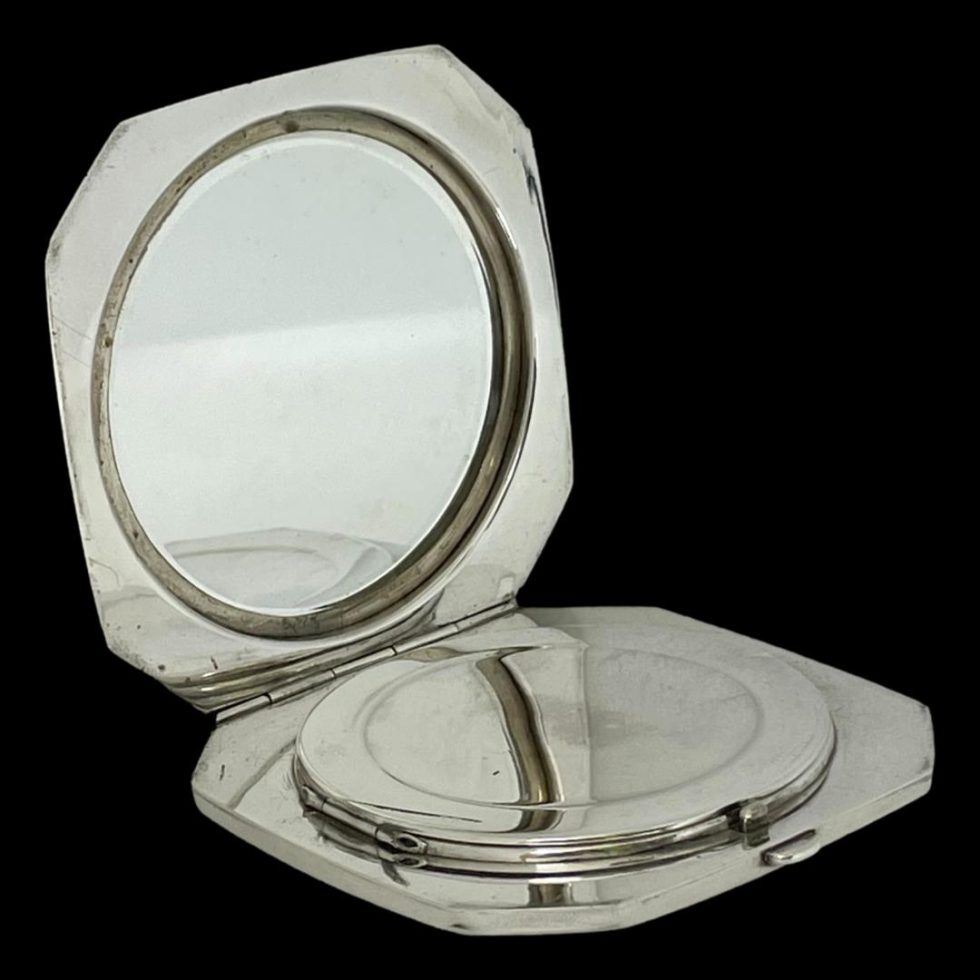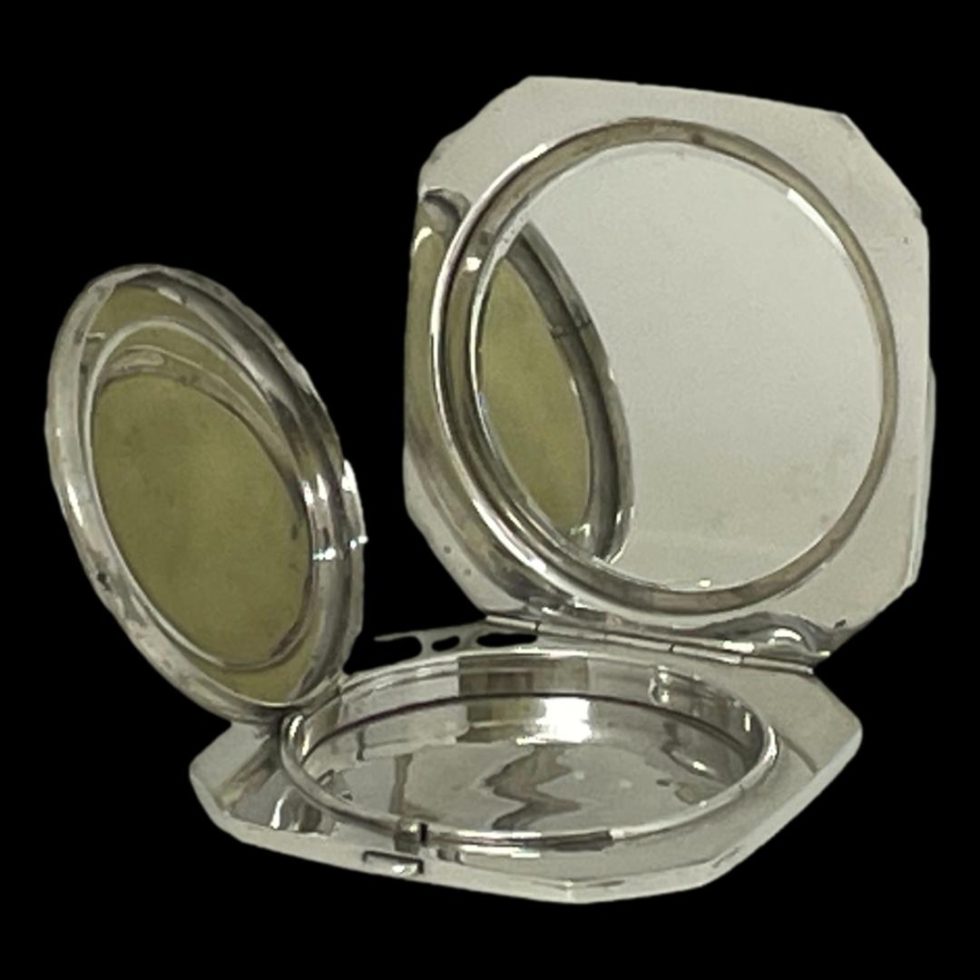 The vintage Oriental 950 silver compact features an octagonal shape that opens to reveal a mirror and powder holder.