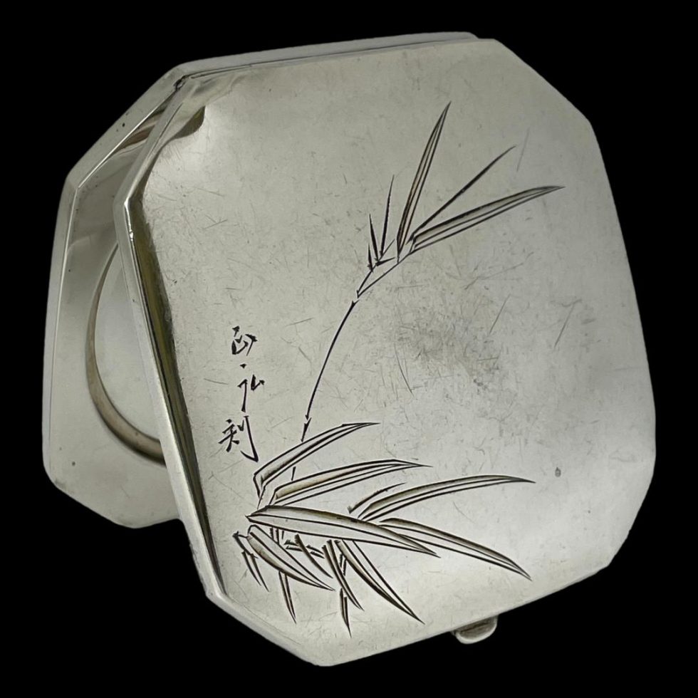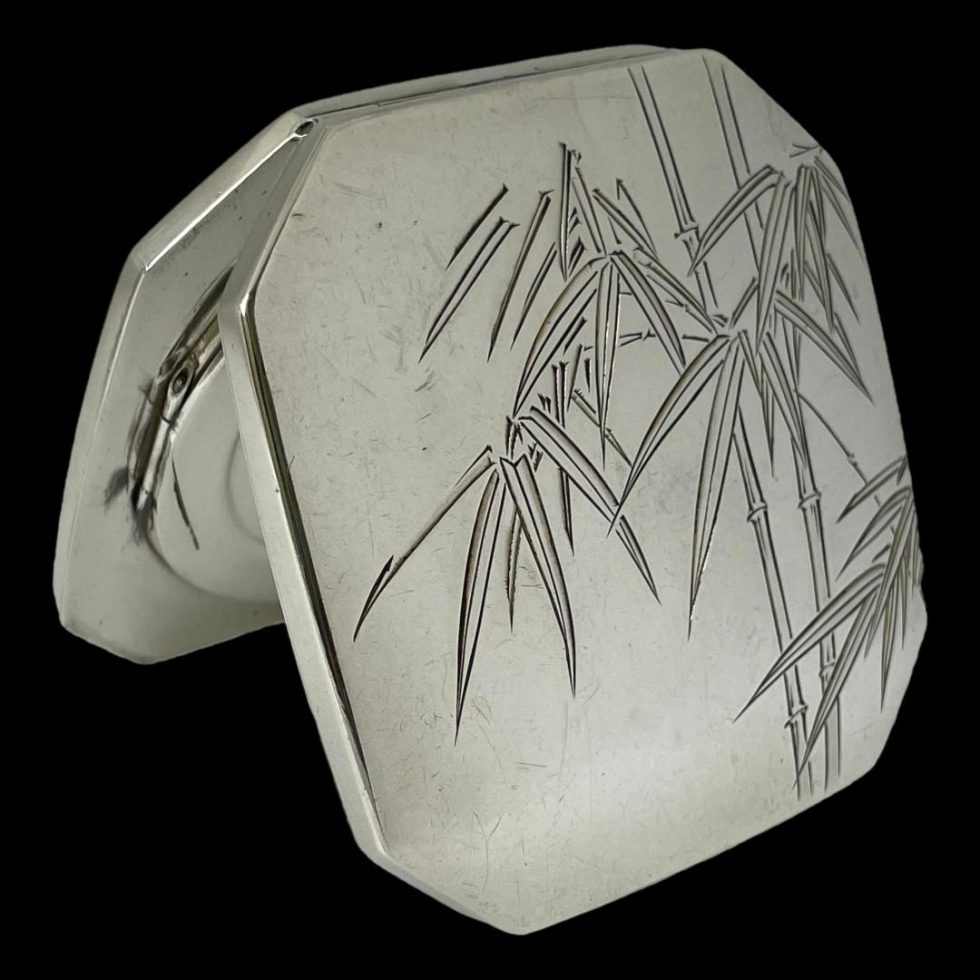 Vintage Oriental compact in 950 grade silver. A lovely octagonal shaped 950 silver compact with etched bamboo decoration to both sides of the exterior and an Oriental signature to the base side. Empty of powder. The compact has a good tight closure and mirror in good order. Overall condition is good apart from a few small dinks and a scratch to left side of powder cover. Hallmarked Silver 950 to the inside. 116 grams.