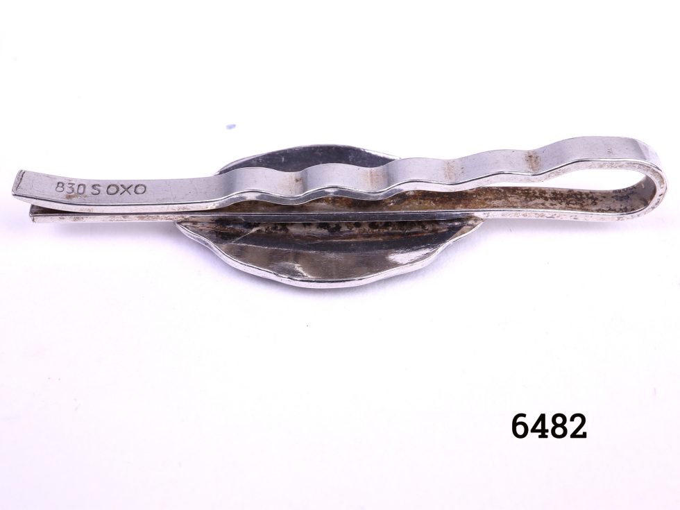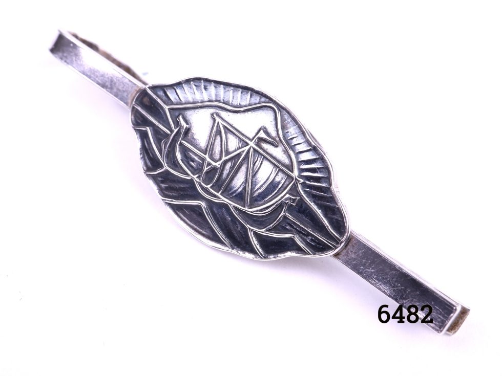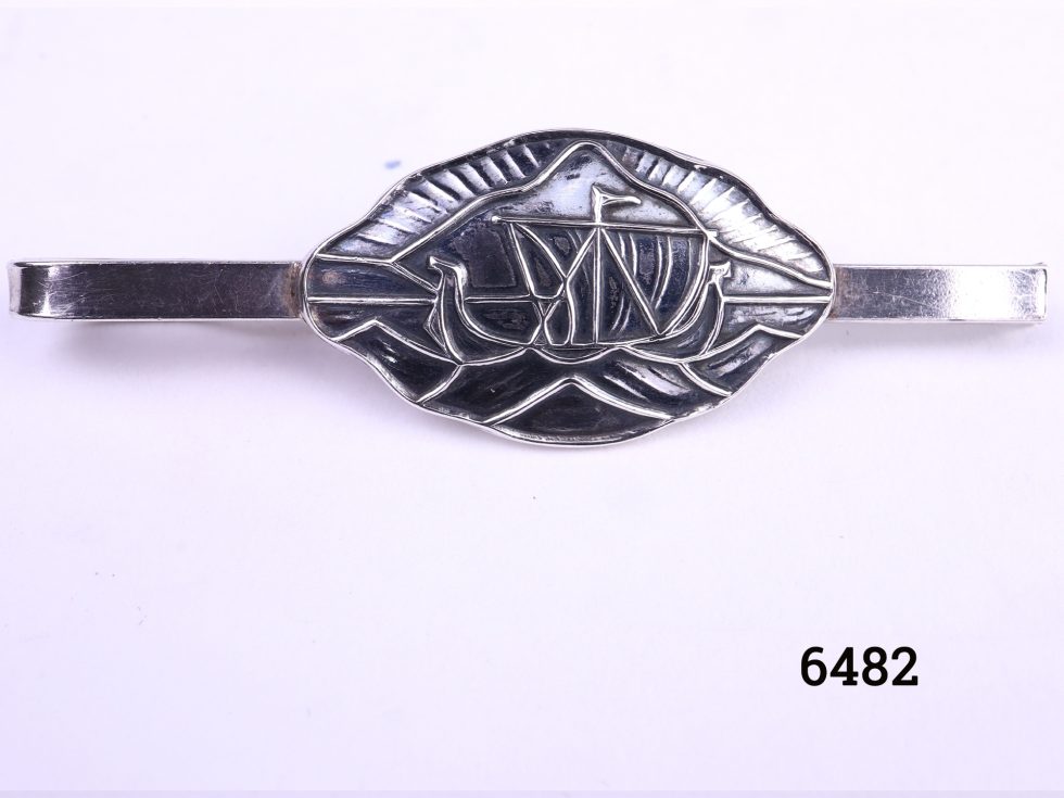 Vintage Ostrem Norwegian 830 grade silver tie clip with Viking longship and mountains design Hallmarked 830 S OXO