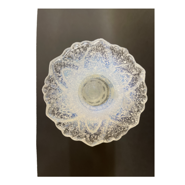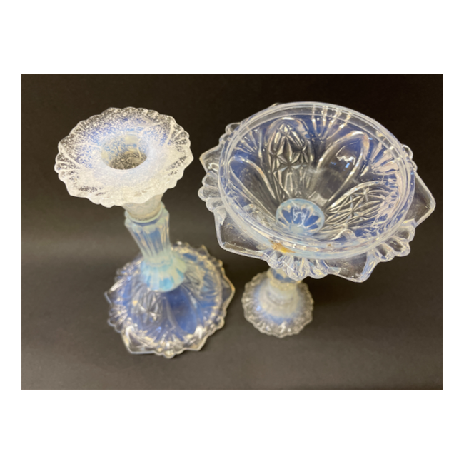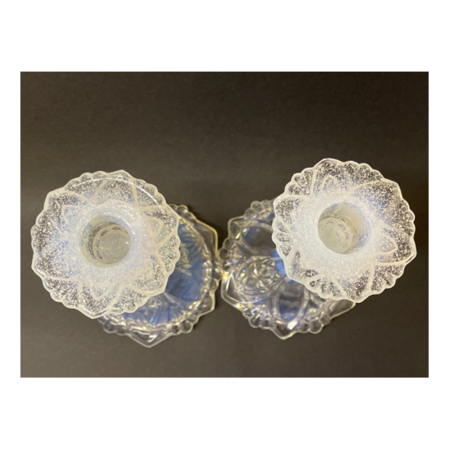 Pair of 1930s vaseline glass candlesticks. A fabulous pair of Art Deco candlesticks made of vaseline glass. The colour changes from pale blue to yellow with hints of pink depending on the angle & light. The sconce area or top of the candlestick has specks of white dots in the glass giving an effect of snowing. There is a very slight size difference therefore measurements are approximately given. Base 115mm in diameter, top 65mm in diameter with candle slot at 20mm and 180mm tall. (782gms)